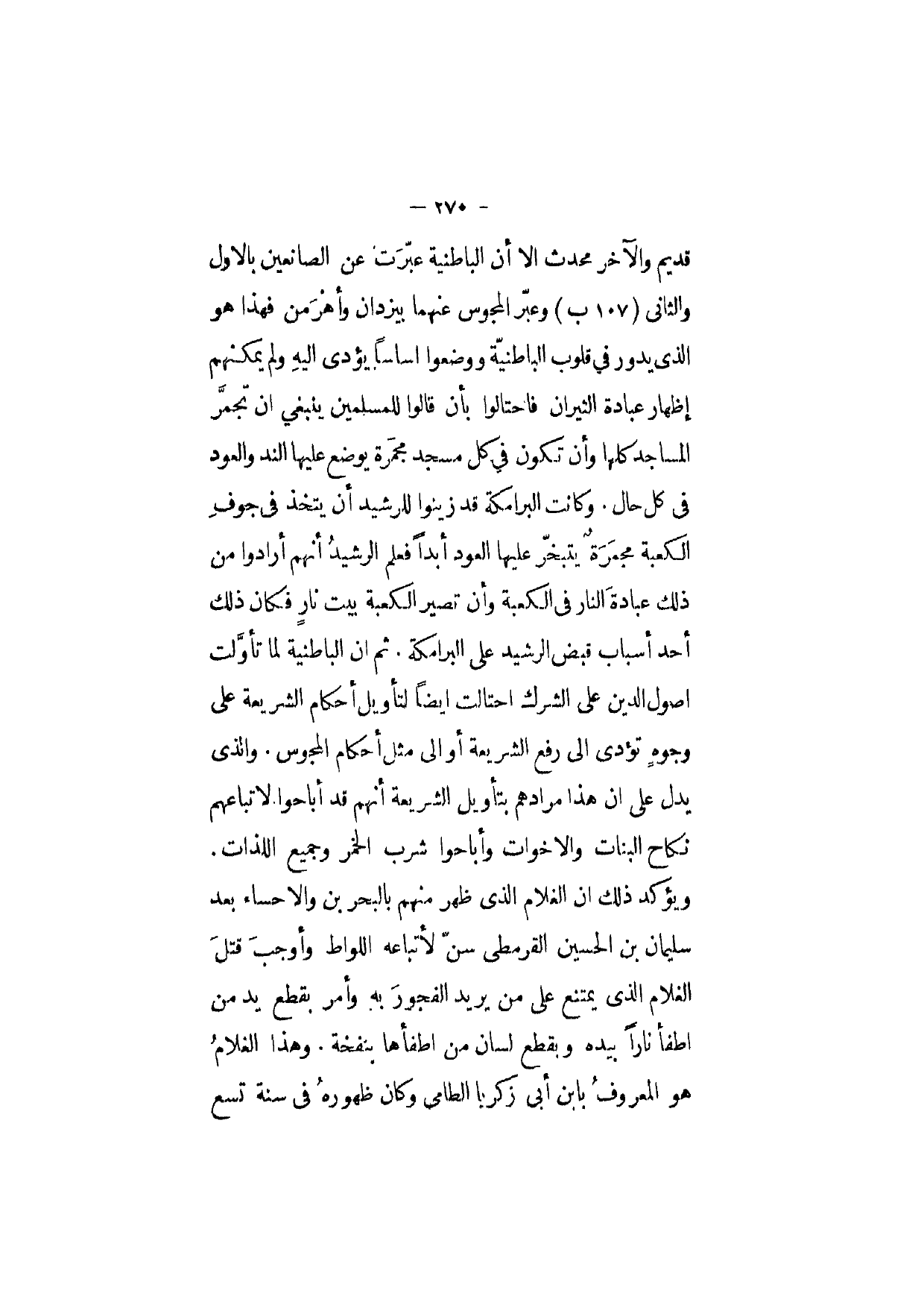 قديم وَالْآخر مُحدث الا أَن الباطنية عبرت عَن الصانعين بالاول والثانى وَعبر الْمَجُوس عَنْهُمَا بيزدان وأهر من فَهَذَا هُوَ الذى يَدُور فِي قُلُوب الباطنية وَوَضَعُوا اساسا يُؤدى اليه وَلم يُمكنهُم إِظْهَار عبَادَة الثيران فاحتالوا بِأَن قَالُوا للْمُسلمين ينبغى ان تجمر الْمَسَاجِد كلهَا وَأَن تكون فى كل مَسْجِد مجمرة يوضع عَلَيْهَا الند وَالْعود فى كل حَال وَكَانَت البرامكة قد زَينُوا للرشيد أَن يتَّخذ فى جَوف الْكَعْبَة مجمرة يتبخر عَلَيْهَا الْعود أبدا فَعلم الرشيد أَنهم أَرَادوا من ذَلِك عبَادَة النَّار فى الْكَعْبَة وَأَن تصير الْكَعْبَة بَيت نَار فَكَانَ ذَلِك أحد أَسبَاب قبض الرشيد على البرامكة ثمَّ ان الباطنية لما تأولت اصول الدّين على الشّرك احتالت ايضا لتأويل أَحْكَام الشَّرِيعَة على وُجُوه تُؤَدّى الى رفع الشَّرِيعَة أَو الى مثل أَحْكَام الْمَجُوس والذى يدل على ان هَذَا مُرَادهم بِتَأْوِيل الشَّرِيعَة أَنهم قد اباحوا لاتباعهم نِكَاح الْبَنَات والاخوات وأباحوا شرب الْخمر وَجَمِيع اللَّذَّات