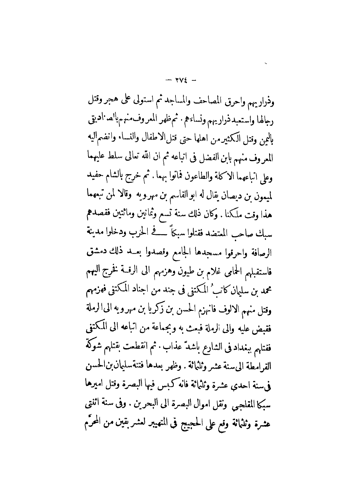 وذراريهم واحرق الْمَصَاحِف والمساجد ثمَّ استولى على هجر وَقتل رجالها واستعبد ذَرَارِيهمْ ونساءهم ثمَّ ظهر الْمَعْرُوف مِنْهُم بالصناديقى بِالْيمن وَقتل الْكثير من اهلها حَتَّى قتل الاطفال وَالنِّسَاء وانضم اليه الْمَعْرُوف مِنْهُم بِابْن الْفضل فى اتِّبَاعه ثمَّ ان الله تَعَالَى سلط عَلَيْهِمَا وعَلى اتباعهما الاكلة والطاعون فماتوا بهما ثمَّ خرج بِالشَّام حفيد لميمون بن ديصان يُقَال لَهُ ابو الْقَاسِم بن مهرويه وَقَالا لمن تبعهما هَذَا وَقت ملكنا وَكَانَ ذَلِك سنة تسع وَثَمَانِينَ وَمِائَتَيْنِ فقصدهم سبك صَاحب المعتضد فَقتلُوا سبكا فى الْحَرْب ودخلوا مَدِينَة الرصافة واحرقوا مَسْجِدهَا الْجَامِع وقصدوا بعد ذَلِك دمشق فَاسْتَقْبَلَهُمْ الحمامى غُلَام بن طيون وَهَزَمَهُمْ الى الرقة فَخرج اليهم مُحَمَّد بن سُلَيْمَان كَاتب المكتفى فى جند من اجناد المكتفى فَهَزَمَهُمْ وَقتل مِنْهُم الالوف فَانْهَزَمَ الْحسن بن زَكَرِيَّا بن مهرويه الى الرملة فَقبض عَلَيْهِ والى الرملة فَبعث بِهِ وبجماعة من اتِّبَاعه الى المكتفى فَقَتلهُمْ بِبَغْدَاد فى الشَّارِع باشد عَذَاب ثمَّ انْقَطَعت بِقَتْلِهِم شَوْكَة القرامطة الى سنة عشر وثلثمائة وَظهر بعْدهَا فتْنَة سُلَيْمَان بن الْحسن فى سنة احدى عشرَة وثلثمائة فانه كبس فِيهَا الْبَصْرَة وَقتل اميرها سبكا المقلجى وَنقل اموال الْبَصْرَة الى الْبَحْرين وفى سنة اثنتى عشرَة وثلثمائة وَقع على الحجيج فى المتهيبر لعشر بَقينَ من الْمحرم