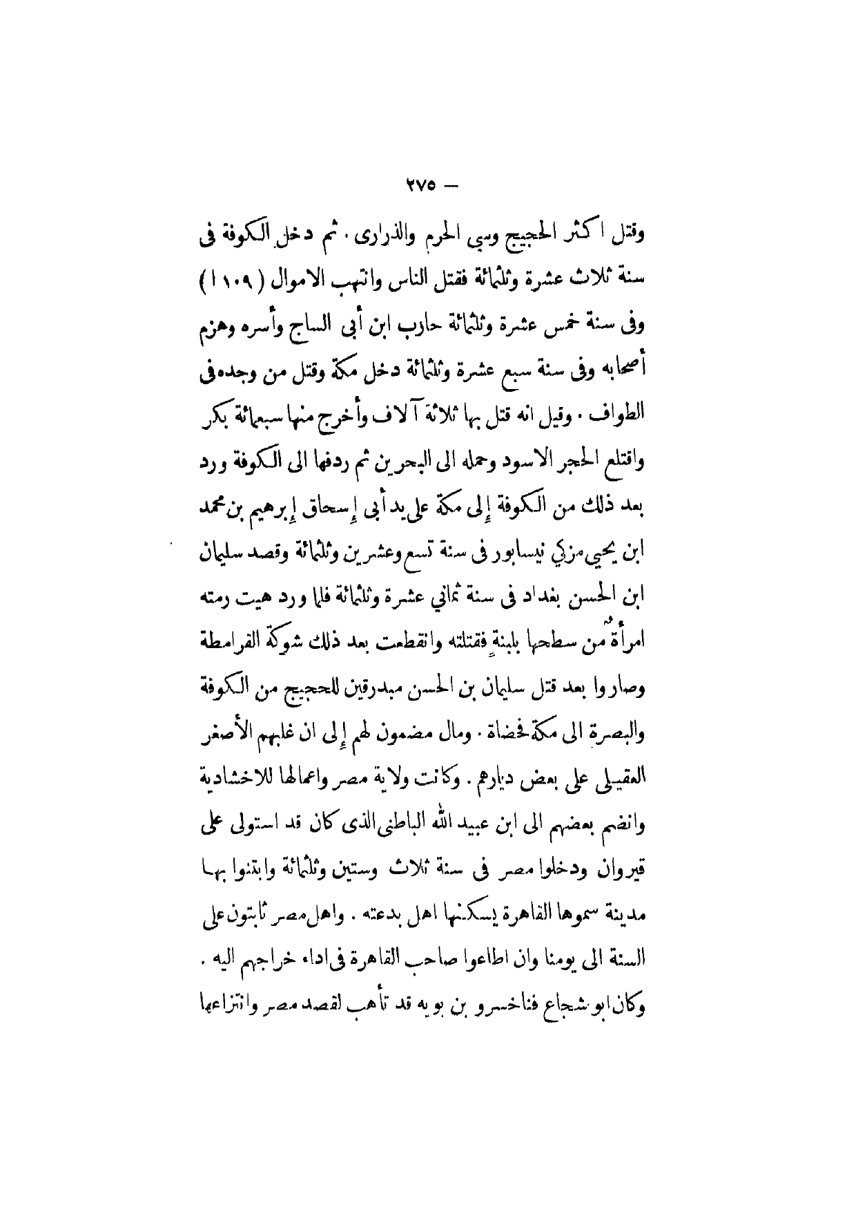 وَقتل اكثر الحجيج وسبى الْحرم والذرارى ثمَّ دخل الْكُوفَة فى سنة ثَلَاث عشرَة وثلثمائة فَقتل النَّاس وانتهب الاموال وفى سنة خمس عشرَة وثلثمائة حَارب ابْن أَبى الساج وأسره وَهزمَ أَصْحَابه وفى سنة سبع عشرَة وثلثمائة دخل مَكَّة وَقتل من وجده فى الطّواف وَقيل انه قتل بهَا ثَلَاثَة آلَاف وَأخرج مِنْهَا سَبْعمِائة بكر واقتلع الْحجر الاسود وَحمله الى الْبَحْرين ثمَّ ردفها الى الْكُوفَة ورد بعد ذَلِك من الْكُوفَة الى مَكَّة على يَد ابى إِسْحَاق إِبْرَاهِيم بن مُحَمَّد ابْن يحيى مزكي نيسابور فى سنة تسع وَعشْرين وثلثمائة وَقصد سُلَيْمَان ابْن الْحسن بَغْدَاد فى سنة ثمانى عشرَة وثلثمائة فَلَمَّا ورد هيت رمته امْرَأَة من سطحها بلبنة فَقتلته وانقطعت بعد ذَلِك شَوْكَة القرامطة وصاروا بعد قتل سُلَيْمَان بن الْحسن مبدرقين للحجيج من الْكُوفَة وَالْبَصْرَة الى مَكَّة فحضاة وَمَال مَضْمُون لَهُم إِلَى ان غلبهم الْأَصْغَر العقيلى على بعض دِيَارهمْ وَكَانَت ولَايَة مصر واعمالها للاخشادية وانضم بَعضهم الى ابْن عبيد الله الباطنى الذى كَانَ قد استولى على قيروان ودخلوا مصر فى سنة ثَلَاث وَسِتِّينَ وثلثمائة وابتنوا بهَا مَدِينَة سَموهَا الْقَاهِرَة يسكنهَا اهل بدعته واهل مصر ثابتون على السّنة الى يَوْمنَا وان اطاعوا صَاحب الْقَاهِرَة فى اداء خراجهم اليه وَكَانَ ابو شُجَاع فناخسرو بن بويه قد تأهب لقصد مصر وانتزاعها