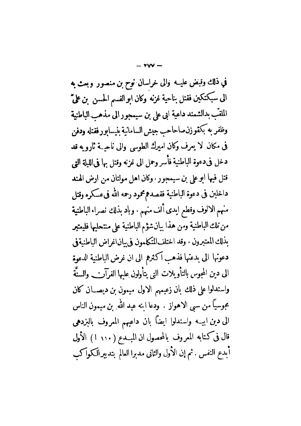 فِي ذَلِك وَقبض عَلَيْهِ والى خُرَاسَان نوح بن مَنْصُور وَبعث بِهِ الى سبكتكين فَقتل بِنَاحِيَة غزنه وَكَانَ ابو الْقسم الْحسن بن على الملقب بُد الشمند دَاعِيَة ابى على بن سيمجور الى مَذْهَب الباطنية وظفر بِهِ بكفوزن صاحاحب جَيش السامانية بنيسابور فَقتله وَدفن فى مَكَان لَا يعرف وَكَانَ اميرك الطوسى والى نَاحيَة ثارويه قد دخل فى دَعْوَة الباطنية فَأسر وَحمل الى غزته وَقتل بهَا فى اللَّيْلَة الَّتِى قتل فِيهَا ابو على بن سيمجور وَكَانَ اهل مولتان من ارْض الْهِنْد داخلين فى دَعْوَة الباطنية فقصدهم مَحْمُود رَحمَه الله فى عسكره وَقتل مِنْهُم الالوف وَقطع ايدى ألف مِنْهُم وباد بذلك نصراء الباطنية من تِلْكَ الباطنية وَمن هَذَا بَيَان شُؤْم الباطنية على منتحليها فليعتبر بذلك المعتبرون وَقد اخْتلف المتكلمون فى بَيَان اغراض الباطنية فى دعوتها الى بدعتها فَذهب اكثرهم الى ان غَرَض الباطنية الدعْوَة الى دين الْمَجُوس بالتأويلات الَّتِى يتأولون عَلَيْهَا الْقُرْآن وَالسّنة وَاسْتَدَلُّوا على ذَلِك بَان زعيمهم الاول مَيْمُون بن ديصان كَانَ مجوسيا من سبى الاهواز ودعا ابْنه عبد الله بن مَيْمُون النَّاس الى دين ابيه وَاسْتَدَلُّوا ايضا بَان داعيهم الْمَعْرُوف بالبزدي قَالَ فى كِتَابه الْمَعْرُوف بالمحصول ان الْمُبْدع الأول أبدع النَّفس ثمَّ إِن الأول والثانى مُدبر الْعَالم بتدبير الْكَوَاكِب