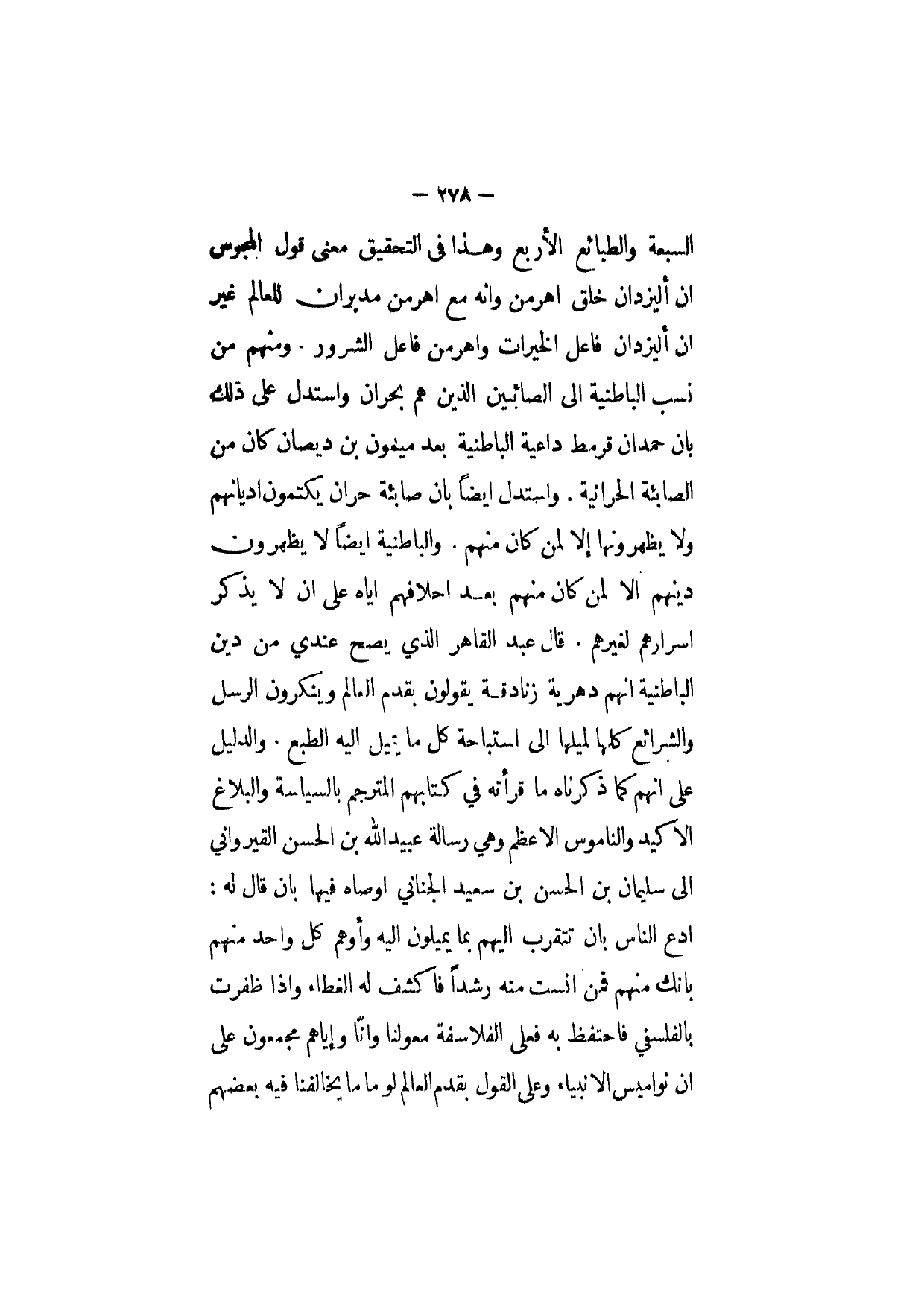 السَّبْعَة والطبائع الْأَرْبَع وَهَذَا فى التَّحْقِيق معنى قَول الْمَجُوس ان أليزدان خلق اهرمن وانه مَعَ اهرمن مدبران للْعَالم غير ان أليزدان فَاعل الْخيرَات واهرمن فَاعل الشرور وَمِنْهُم من نسب الباطنية الى الصابئين الَّذين هم بحران وَاسْتدلَّ على ذَلِك بَان حمدَان قرمط دَاعِيَة الباطنية بعد مَيْمُون بن ديصان كَانَ من الصابئة الحرانية وَاسْتدلَّ ايضا بَان صابئة حران يكتمون اديانهم وَلَا يظهرونها إِلَّا لمن كَانَ مِنْهُم والباطنية ايضا لَا يظهرون دينهم الا لمن كَانَ مِنْهُم بعد احلافهم اياه على ان لَا يذكر اسرارهم لغَيرهم قَالَ عبد القاهر الذى يَصح عِنْدِي من دين الباطنية انهم دهرية زنادقة يَقُولُونَ بقدم الْعَالم وَيُنْكِرُونَ الرُّسُل والشرائع كلهَا لميلها الى اسْتِبَاحَة كل مَا يمِيل اليه الطَّبْع وَالدَّلِيل على انهم كَمَا ذَكرْنَاهُ مَا قرأته فِي كِتَابهمْ المترجم بالسياسة والبلاغ الاكيد والناموس الاعظم وَهِي رِسَالَة عبيد الله بن الْحسن القيرواني الى سُلَيْمَان بن الْحسن بن سعيد الجناني اوصاه فِيهَا بَان قَالَ لَهُ ادْع النَّاس بَان تتقرب اليهم بِمَا يميلون اليه وأوهم كل وَاحِد مِنْهُم بأنك مِنْهُم فَمن انست مِنْهُ رشدا فاكشف لَهُ الغطاء واذا ظَفرت بالفلسفي فاحتفظ بِهِ فعلى الفلاسفة معولنا وانا وإياهم مجمعون على ان نواميس الانبياء وعَلى القَوْل بقدم الْعَالم لَو ماما يخالفنا فِيهِ بَعضهم