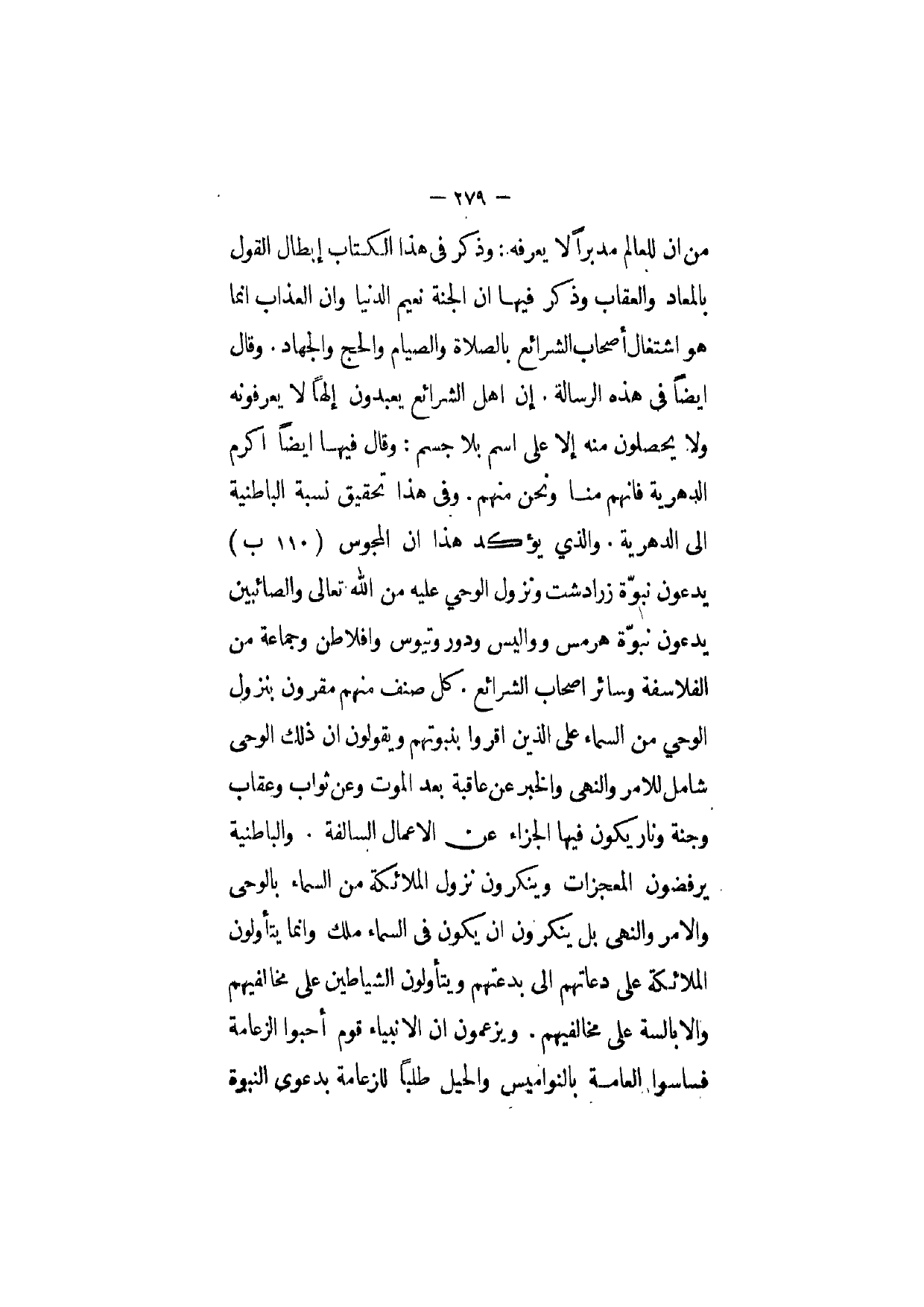 من ان للْعَالم مُدبرا لَا يعرفهُ وَذكر فى هَذَا الْكتاب إبِْطَال القَوْل بالمعاد وَالْعِقَاب وَذكر فِيهَا ان الْجنَّة نعيم الدُّنْيَا وان الْعَذَاب انما هُوَ اشْتِغَال أَصْحَاب الشَّرَائِع بِالصَّلَاةِ وَالْحج وَالْجهَاد وَقَالَ ايضا فى هَذِه الرسَالَة إِن اهل الشَّرَائِع يعْبدُونَ إِلَهًا لَا يعرفونه وَلَا يحصلون مِنْهُ إِلَّا على اسْم بِلَا جسم وَقَالَ فِيهَا ايضا اكرم الدهرية فانهم منا وَنحن مِنْهُم وفى هَذَا تَحْقِيق نِسْبَة الباطنية الى الدهرية والذى يُؤَكد هَذَا ان الْمَجُوس يدعونَ نبوة زرادشت ونزول الْوَحْي عَلَيْهِ من الله تَعَالَى والصائبين يدعونَ نبوة هرمس وواليس ودوروتيوس وافلاطن وَجَمَاعَة من الفلاسفة وَسَائِر اصحاب الشَّرَائِع كل صنف مِنْهُم مقرون بنزول الْوَحْي من السَّمَاء على الَّذين اقروا بنبوتهم وَيَقُولُونَ ان ذَلِك الوحى شَامِل للامر والنهى وَالْخَبَر عَن عَاقِبَة بعد الْمَوْت وَعَن ثَوَاب وعقاب وجنه ونار يكون فِيهَا الْجَزَاء عَن الاعمال السالفة والباطنية يرفضون المعجزات وَيُنْكِرُونَ نزُول الْمَلَائِكَة من السَّمَاء بالوحى والامر والنهى بل يُنكرُونَ ان يكون فى السَّمَاء ملك وانما يتأولون الْمَلَائِكَة على دُعَائِهِمْ الى بدعتهم ويتأولون الشَّيَاطِين على مخالفيهم والابالسة على مخالفيهم ويزعمون ان الانبياء قوم أَحبُّوا الزعامة فساسوا الْعَامَّة بالنواميس والحيل طلبا للزعامة بِدَعْوَى النُّبُوَّة