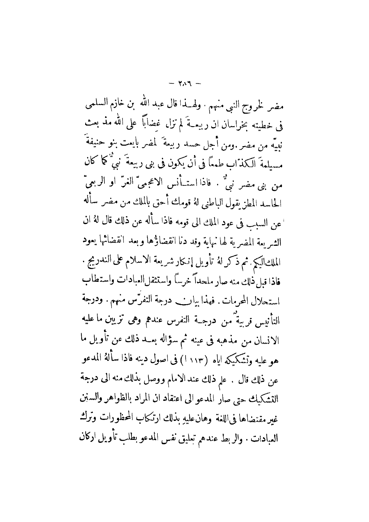 مُضر لخُرُوج النبى مِنْهُم وَلِهَذَا قَالَ عبد الله بن خازم السلمى فى خطبَته بخراسان ان ربيعَة لم تزل غضابا على الله مذ بعث نبيه من مُضر وَمن أجل حسد ربيعَة لمضر بَايَعت بَنو حنيفَة مُسَيْلمَة الْكذَّاب طَمَعا فى ان يكون فى بنى ربيعَة نبى كَمَا كَانَ من بنى مُضر نبى فاذا استأنس الاعجمى الغر اَوْ الربعى الْحَاسِد المطز يَقُول الباطنى لَهُ قَوْمك أَحَق بِالْملكِ من مُضر سَأَلَهُ عَن السَّبَب فى عود الْملك الى قومه فاذا سَأَلَهُ عَن ذَلِك قَالَ لَهُ ان الشَّرِيعَة المضرية لَهَا نِهَايَة وَقد دنا انقضاؤها وَبعد انْقِضَائِهَا يعود الْملك اليكم ثمَّ ذكر لَهُ تَأْوِيل إِنْكَار شَرِيعَة الاسلام على التدريج فاذا قبل ذَلِك مِنْهُ صَار ملحدا خرسا واستثقل الْعِبَادَات واستطاب استحلال الْمُحرمَات فَهَذَا بَيَان دَرَجَة التفرس مِنْهُم ودرجة التأنيس قربية من دَرَجَة التفرس عِنْدهم وهى تَزْيِين مَا عَلَيْهِ الانسان من مذْهبه فى عينه ثمَّ سُؤَاله بعد ذَلِك عَن تَأْوِيل مَا هُوَ عَلَيْهِ وتشكيكه اياه فى اصول دينه فاذا سَأَلَهُ الْمَدْعُو عَن ذَلِك قَالَ علم ذَلِك عِنْد الامام وَوصل بذلك مِنْهُ الى دَرَجَة التشكيك حَتَّى صَار الْمَدْعُو الى اعْتِقَاد ان المُرَاد بالظواهر وَالسّنَن غير مقتضاها فى اللُّغَة وَهَان عَلَيْهِ بذلك ارْتِكَاب الْمَحْظُورَات وَترك الْعِبَادَات والربط عِنْدهم تَعْلِيق نفس الْمَدْعُو بِطَلَب تَأْوِيل اركان