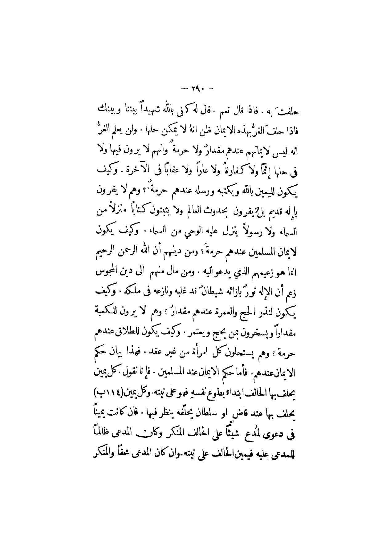 حَلَفت بِهِ فاذا قَالَ نعم قَالَ لَهُ كفى بِاللَّه شَهِيدا بَيْننَا وَبَيْنك فاذا حلف الغر بِهَذِهِ الايمان ظن انه لَا يُمكن حلهَا وَلنْ يعلم الغر انه لَيْسَ لايمانهم عِنْدهم مِقْدَار وَلَا حُرْمَة وانهم لَا يرَوْنَ فِيهَا وَلَا فى حلهَا إِثْمًا وَلَا كَفَّارَة وَلَا عارا وَلَا عقَابا فى الْآخِرَة وَكَيف يكون للْيَمِين بِاللَّه وبكتبه وَرُسُله عِنْدهم حُرْمَة وهم لَا يقرونَ بإله قديم بل يقرونَ بحدوث الْعَالم وَلَا يثبتون كتابا منزلا من السَّمَاء وَلَا رَسُولا ينزل عَلَيْهِ الْوَحْي من السَّمَاء وَكَيف يكون لايمان الْمُسلمين عِنْدهم حُرْمَة وَمن دينهم أَن الله الرَّحْمَن الرَّحِيم انما هُوَ زعيمهم الَّذِي يَدْعُو اليه وَمن مَال مِنْهُم الى دين الْمَجُوس زعم أَن الْإِلَه نور بازائه شَيْطَان قد غَلبه ونازعه فى ملكه وَكَيف يكون لنذر الْحَج وَالْعمْرَة عِنْدهم مِقْدَار وهم لَا يرَوْنَ للكعبة مِقْدَارًا ويسخرون بِمن يحجّ ويعتمر وَكَيف يكون للطَّلَاق عِنْدهم حُرْمَة وهم يسْتَحلُّونَ كل امْرَأَة من غير عقد فَهَذَا بَيَان حكم الايمان عِنْدهم فَأَما حكم الايمان عِنْد الْمُسلمين فَإنَّا نقُول كل يَمِين يحلف بهَا الْحَالِف ابْتِدَاء بطوع نَفسه فَهُوَ على نِيَّته وكل يَمِين يحلف بهَا عِنْد قَاض اَوْ سُلْطَان يحلفهُ ينظر فِيهَا فان كَانَت يَمِينا فى دَعْوَى لمدع شَيْئا على الْحَالِف الْمُنكر وَكَانَ الْمُدعى ظَالِما للْمُدَّعى عَلَيْهِ فِيمَن الْحَالِف على نِيَّته وان كَانَ الْمُدعى محقا وَالْمُنكر