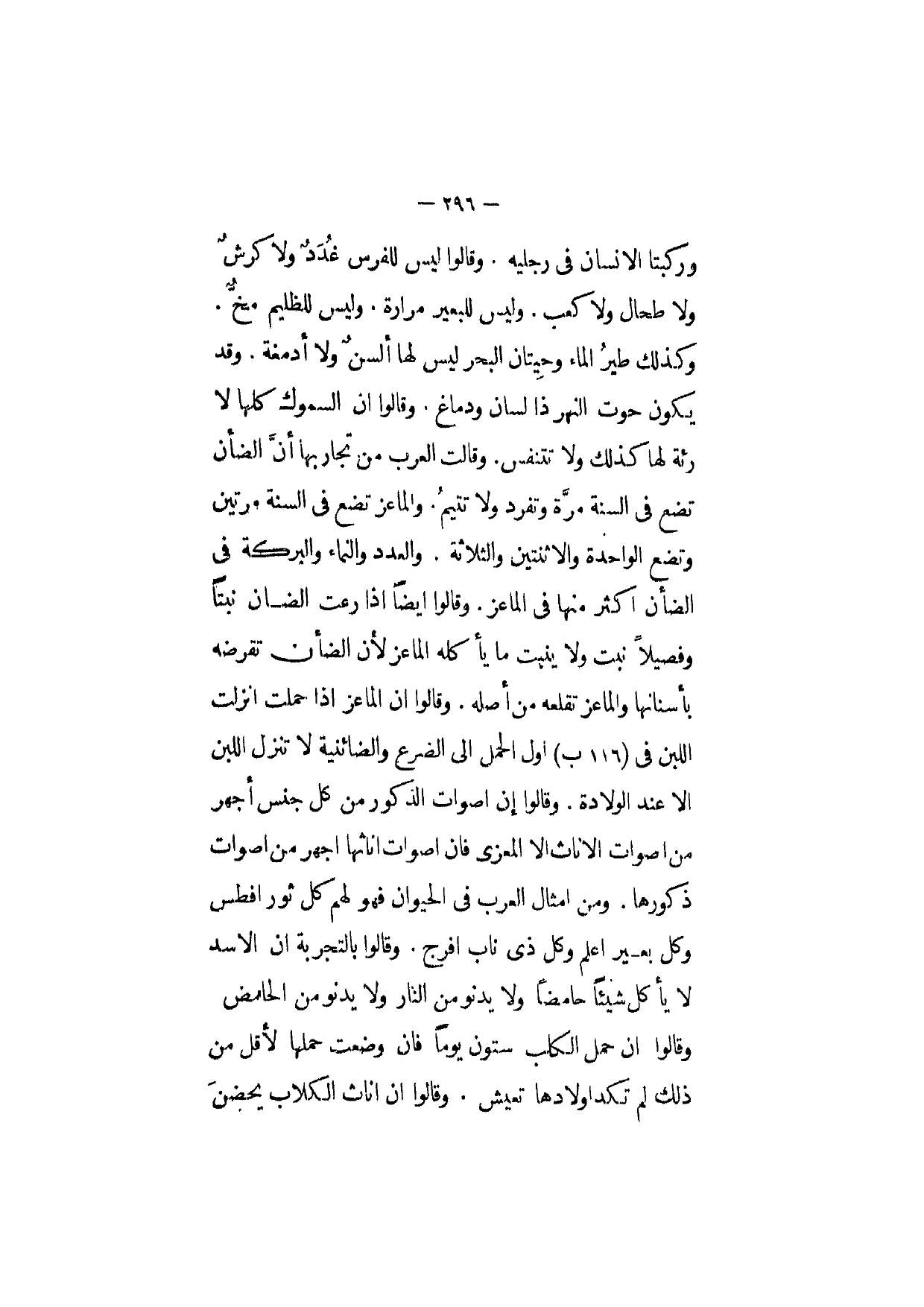 وركبتا الانسان فى رجلَيْهِ وَقَالُوا لَيْسَ للْفرس غدد وَلَا كرش وَلَا طحال وَلَا كَعْب وَلَيْسَ للبعير مرَارَة وَلَيْسَ للظليم مخ وَكَذَلِكَ طير المَاء وحيتان الْبَحْر لَيْسَ لَهَا ألسن وَلَا أدمغة وَقد يكون حوت النَّهر ذَا لِسَان ودماغ وَقَالُوا ان السموك كلهَا لَا رئة لَهَا كَذَلِك وَلَا تتنفس وَقَالَت الْعَرَب من تجاربها ان الضَّأْن تضع فى السّنة مرّة وَتفرد وَلَا تتيم والماعز تضع فى السّنة مرَّتَيْنِ وتضع الْوَاحِدَة والاثنتين وَالثَّلَاثَة وَالْعدَد والنماء وَالْبركَة فى الضَّأْن اكثر مِنْهَا فى الماعز وَقَالُوا ايضا اذا رعت الضان نبتا وفصيلا نبت وَلَا ينْبت مَا يَأْكُلهُ الماعز لِأَن الضَّأْن تقرضه بأسنانها والماعز 2 تقلعه من أَصله وَقَالُوا ان الماعز اذا حملت انزلت اللَّبن اول الْحمل الى الضَّرع والضائنية لَا تنزل اللَّبن الا عِنْد الْولادَة وَقَالُوا إِن اصوات الذُّكُور من كل جنس أَجْهَر من اصوات الاناث الا المعزى فان اصوات اناثها اجهر من اصوات ذكورها وَمن امثال الْعَرَب فى الْحَيَوَان فَهُوَ لَهُم كل ثَوْر افطس وكل بعير اعْلَم وكل ذى نَاب افرج وَقَالُوا بالتجربة ان الاسد لَا يَأْكُل شَيْئا حامضا وَلَا يدنو من النَّار وَلَا يدنو من الحامض وَقَالُوا ان حمل الْكَلْب سِتُّونَ يَوْمًا فان وضعت حملهَا لأَقل من ذَلِك لم تكد اولادها تعيش وَقَالُوا ان اناث الْكلاب يحضن