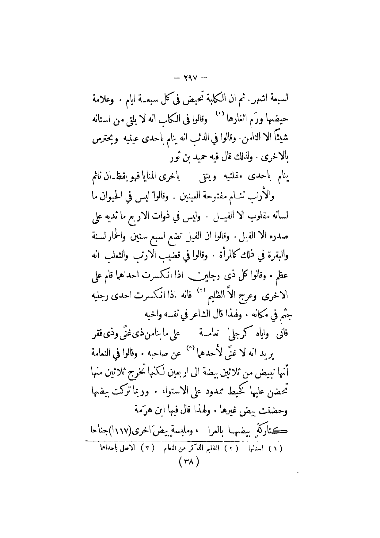 لسبعة اشهر ثمَّ ان الكلبة تحيض فى كل سَبْعَة ايام وعلامة حَيْضهَا ورم اثغارها وَقَالُوا فى الْكَلْب انه لَا يلقى من اسنانه شَيْئا الا الثَّامِن وَقَالُوا فى الذِّئْب انه ينَام باجدى عَيْنَيْهِ ويحترس بالاخرى وَلذَلِك قَالَ فِيهِ حميد بن ثَوْر ... ينَام باحدى مقلتيه ويتقى