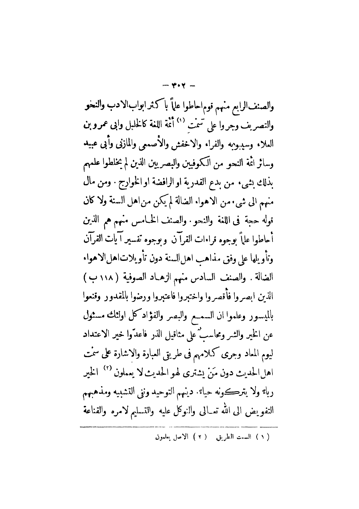 والصنف الرَّابِع مِنْهُم قوم احاطوا علما باكثر ابواب الادب والنحو والتصريف وجروا على سمت أَئِمَّة اللُّغَة كالخليل وابى عَمْرو بن الْعَلَاء وسيبويه وَالْفراء والاخفش والأصمعى والمازنى وأبى عبيد وَسَائِر ائمة النَّحْو من الْكُوفِيّين والبصريين الَّذين لم يخلطوا علمهمْ بذلك بشىء من بدع الْقَدَرِيَّة اَوْ الرافضة اَوْ الْخَوَارِج وَمن مَال مِنْهُم الى شىء من الاهواء الضَّالة لم يكن من اهل السّنة وَلَا كَانَ قَوْله حجَّة فى اللُّغَة والنحو والصنف الْخَامِس مِنْهُم هم الَّذين أحاطوا علما بِوُجُوه قراءات الْقُرْآن وبوجوه تَفْسِير آيَات الْقُرْآن وتأويلها على وفْق مَذَاهِب اهل السّنة دون تأويلات اهل الاهواء الضَّالة والصنف السَّادِس مِنْهُم الزهاد الصُّوفِيَّة الَّذين ابصروا فاقصروا واختبروا فاعتبروا وَرَضوا بالمقدور وقنعوا بالميسور وَعَلمُوا ان السّمع وَالْبَصَر والفؤاد كل اولئك مسئول عَن الْخَيْر وَالشَّر ومحاسب على مَثَاقِيل الذَّر فاعدوا خير الِاعْتِدَاد ليَوْم الْمعَاد وَجرى كَلَامهم فى طريقى الْعبارَة والاشارة على سمت اهل الحَدِيث دون من يشترى لَهو الحَدِيث لَا يعْملُونَ الْخَيْر رِيَاء وَلَا يتركونه حَيَاء دينهم التَّوْحِيد وَنفى التَّشْبِيه ومذهبهم التَّفْوِيض الى الله تَعَالَى والتوكل عَلَيْهِ وَالتَّسْلِيم لامره والقناعة