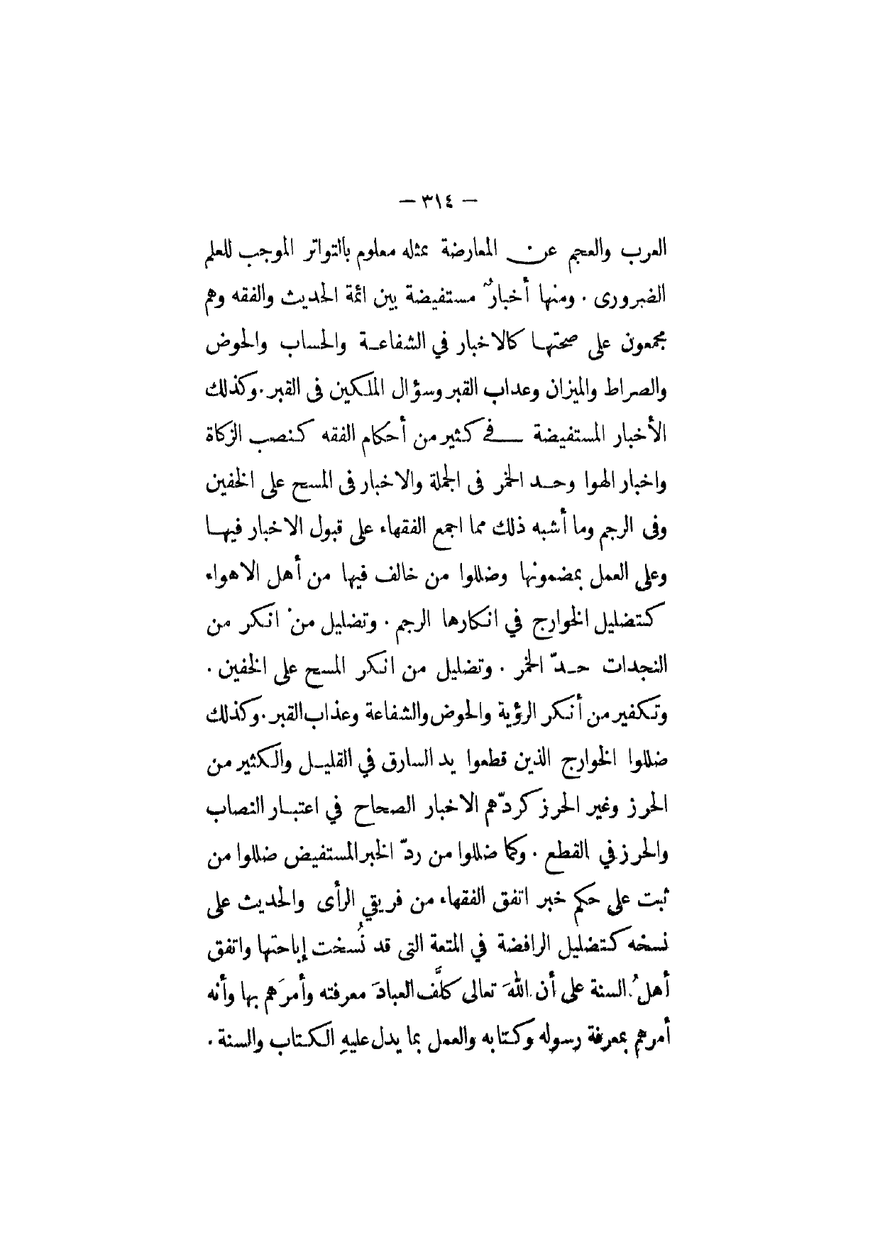 الْعَرَب والعجم عَن الْمُعَارضَة بِمثلِهِ مَعْلُوم بالتواتر الْمُوجب للْعلم الضَّرُورِيّ وَمِنْهَا أَخْبَار مستفيضة بَين ائمة الحَدِيث وَالْفِقْه وهم مجمعون على صِحَّتهَا كالاخبار فِي الشَّفَاعَة والحساب والحوض والصراط وَالْمِيزَان وَعَذَاب الْقَبْر وسؤال الْملكَيْنِ فى الْقَبْر وَكَذَلِكَ الْأَخْبَار المستفيضة فى كثير من احكام الْفِقْه كنصب الزَّكَاة واخبار الهوا وحد الْخمر فى الْجُمْلَة والاخبار فى الْمسْح على الْخُفَّيْنِ وفى الرَّجْم وَمَا أشبه ذَلِك مِمَّا اجْمَعْ الْفُقَهَاء على قبُول الاخبار فِيهَا وعَلى الْعَمَل بمضمونها وضللوا من خَالف فِيهَا من أهل الاهواء كتضليل الْخَوَارِج فِي انكارها الرَّجْم وتضليل من انكر من النجدات حد الْخمر وتضليل من انكر الْمسْح على الْخُفَّيْنِ وتكفير من أنكر الرُّؤْيَة والحوض والشفاعة وَعَذَاب الْقَبْر وَكَذَلِكَ ضللوا الْخَوَارِج الَّذين قطعُوا يَد السَّارِق فِي الْقَلِيل وَالْكثير من الْحِرْز وَغير الْحِرْز كردهم الاخبار الصِّحَاح فِي اعْتِبَار النّصاب والحرز فِي الْقطع وكما ضللوا من رد الْخَبَر المستفيض ضللوا من ثَبت على حكم خبر اتّفق الْفُقَهَاء من فريقي الرأى والْحَدِيث على نسخه كتضليل الرافضة فِي الْمُتْعَة الَّتِى قد نسخت إباحتها وَاتفقَ أهل السّنة على أَن الله تَعَالَى كلف الْعباد معرفَة وَأمرهمْ بهَا وَأَنه أَمرهم بِمَعْرِِفَة رَسُوله وَكتابه وَالْعَمَل بِمَا يدل عَلَيْهِ الْكتاب وَالسّنة