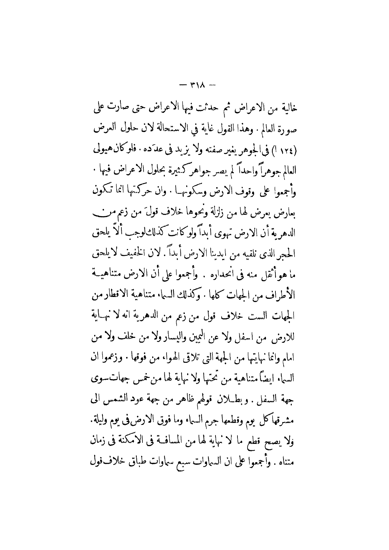 خَالِيَة من الاعراض ثمَّ حدثت فِيهَا الاعراض حَتَّى صَارَت على صُورَة الْعَالم وَهَذَا القَوْل غَايَة فِي الاستحالة لَان حُلُول الْعرض فى الْجَوْهَر يُغير صفته وَلَا يزِيد فى عدده فَلَو كَانَ هيولى الْعَالم جوهرا وَاحِدًا لم يصر جَوَاهِر كَثِيرَة بحلول الاعراض فِيهَا وَأَجْمعُوا على وقُوف الارض وسكونها وان حركتها انما تكون بِعَارِض يعرض لَهَا من زَلْزَلَة وَنَحْوهَا خلاف قَول من زعم من الدهرية أَن الارض تهوى أبدا وَلَو كَانَت كَذَلِك لوَجَبَ الا يلْحق الْحجر الذى نلقيه من ايدينا الارض أبدا لَان الْخَفِيف لَا يلْحق مَا هُوَ أثقل مِنْهُ فى انحداره وَأَجْمعُوا على أَن الارض متناهية الْأَطْرَاف من الْجِهَات كلهَا وَكَذَلِكَ السَّمَاء متناهية الاقطار من الْجِهَات السِّت خلاف قَول من زعم من الدهرية انه لَا نِهَايَة للارض من اسفل وَلَا عَن الْيَمين واليسار وَلَا من خلف وَلَا من امام وانما نهايتها من الْجِهَة الَّتِي تلاقى الْهَوَاء من فَوْقهَا وَزَعَمُوا ان السَّمَاء ايضا متناهية من تحتهَا وَلَا نِهَايَة لَهَا من خمس جِهَات سوى جِهَة السّفل وَبطلَان قَوْلهم ظَاهر من جِهَة عود الشَّمْس الى مشرقها كل يَوْم وقطعها جرم السَّمَاء وَمَا فَوق الارض فى يَوْم وَلَيْلَة وَلَا يَصح قطع مَا لَا نِهَايَة لَهَا من المساقة فى الامكنة فى زمَان متناه وَأَجْمعُوا على ان السَّمَاوَات سبع سماوات طباق خلاف قَول