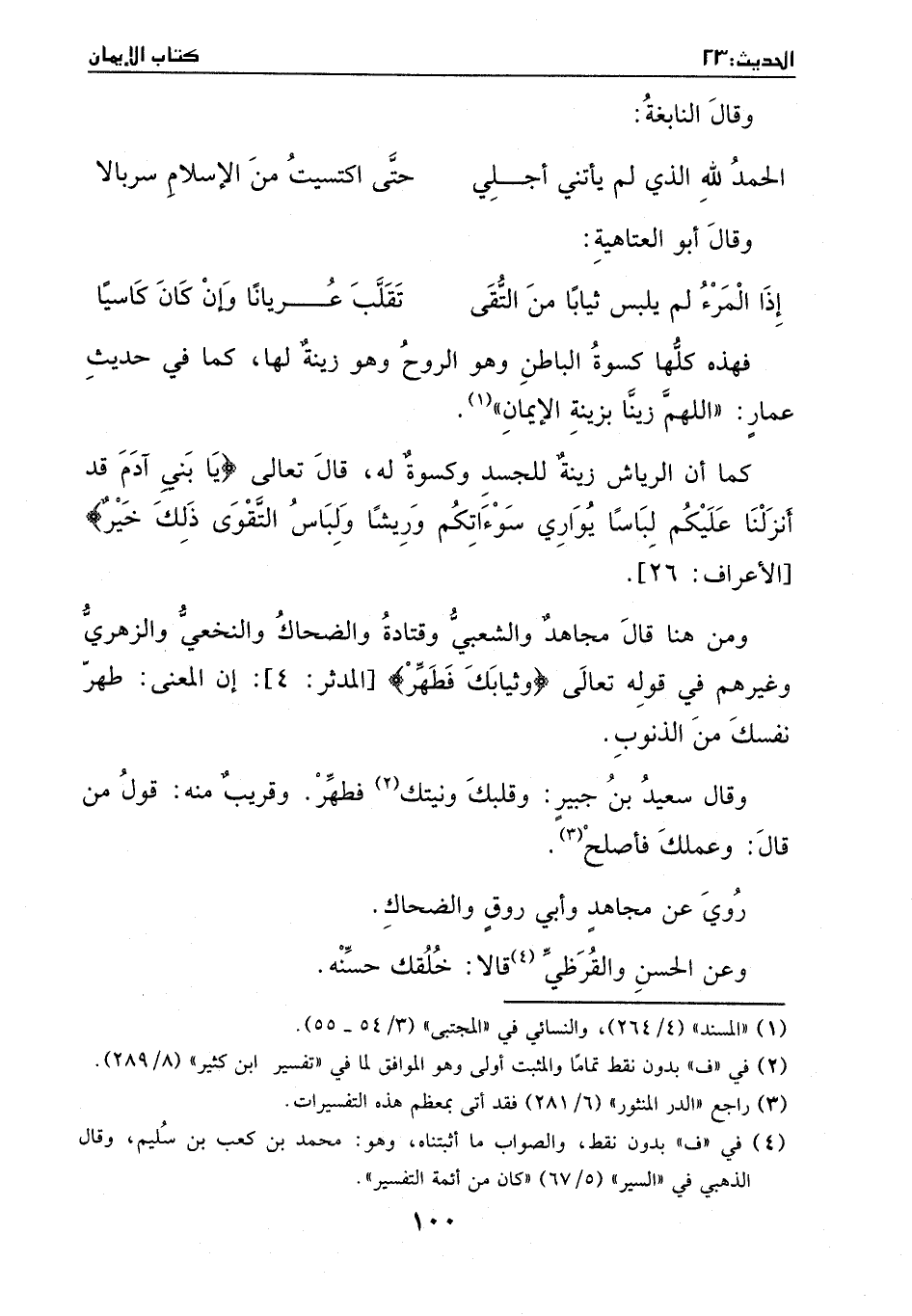 فهذه كلها كسوة الباطن وهو الروح وهو زينة لها، كما في حديث عمار: " اللهم زينا بزينة الإيمان " (¬1) . كما أن الرياش زينة للجسد وكسوة له، قال تعالى {يَا بَنِي آدَمَ قَدْ أَنزَلْنَا عَلَيْكُمْ لِبَاسًا يُوَارِي سَوْءاتِكُمْ وَرِيشًا وَلِبَاسُ التَّقْوَىَ ذَلِكَ خَيْرٌ} [الأعراف: 26] . ومن هنا قال مجاهد والشعبي وقتادة والضحاك والنخعي والزهري وغيرهم في قوله تعالى {وثيابك فطهر} [المدثر: 4] إن المعنى: طهر نفسك من الذنوب.
