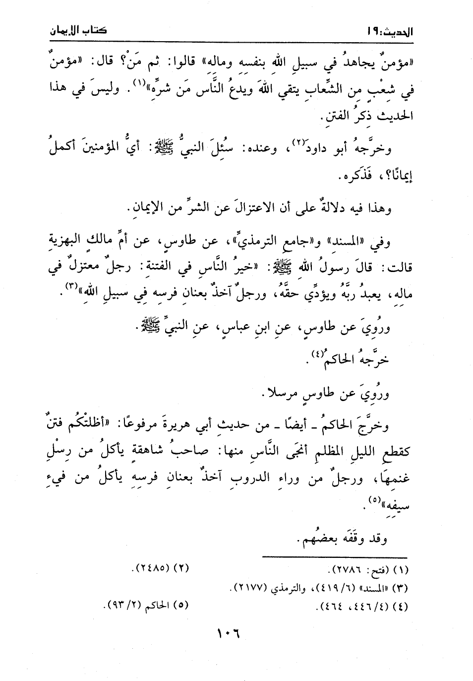 مؤمن يجاهد في سبيل الله بنفسه وماله " قالوا: ثم من؟ قال: " مؤمن في شعب من الشعاب يتقي الله ويدع الناس من شره " (¬1) . وليس في هذا الحديث ذكر الفتن. وخرجه أبو داود (¬2) ، وعنده: سئل النبي صَلَّى اللهُ عَلَيْهِ وَسَلَّمَ: أي المؤمنين أكمل إيمانا؟ . فذكره. وهذا فيه دلالة على أن الاعتزال عن الشر من الإيمان. وفي " المسند " و" جامع الترمذي "، عن طاوس، عن أم مالك البهزية قالت: قال رسول الله: " خير الناس في الفتنة: رجل معتزل في ماله، يعبد ربه ويؤدي حقه، ورجل أخذ بعنان فرسه في سبيل الله " (¬3) .