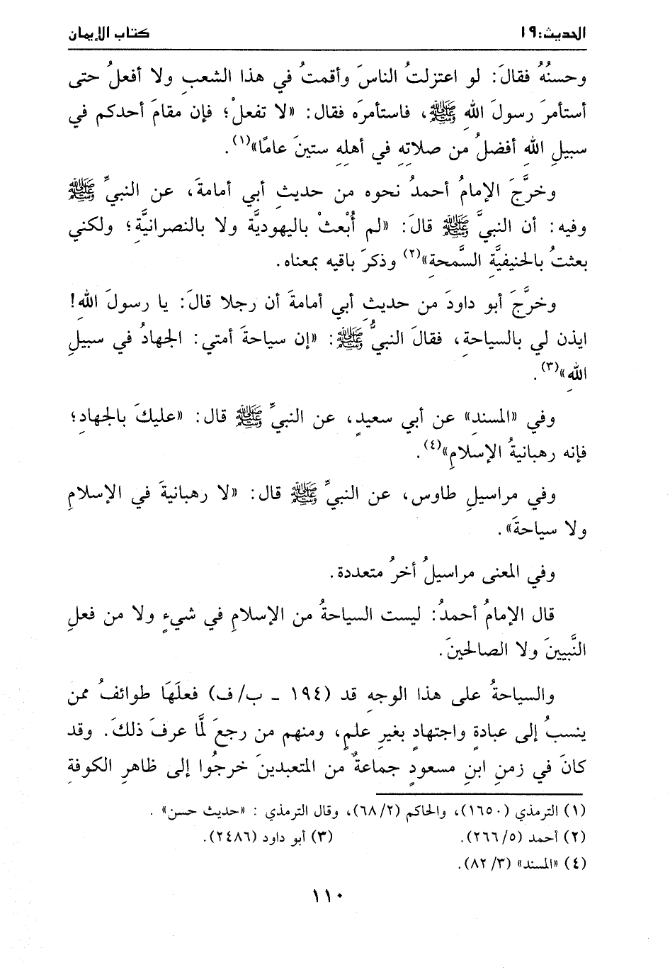 وخرج الإمام أحمد نحوه من حديث أبي أمامة، عن النبي صَلَّى اللهُ عَلَيْهِ وَسَلَّمَ وفيه: أن النبي صَلَّى اللهُ عَلَيْهِ وَسَلَّمَ قال: " لم أبعث باليهودية ولا النصرانية؛ ولكني بعثت بالحنيفية السمحة " (¬2) . وذكر باقيه بمعناه. وخرج داود من حديث أبي أمامة أن رجلا قال: يا رسول الله! ايذن لي بالسياحة، فقال النبي صَلَّى اللهُ عَلَيْهِ وَسَلَّمَ: " إن سياحة أمتي: الجهاد في سبيل الله " (¬3) . وفي " المسند " عن أبي سعيد، عن النبي صَلَّى اللهُ عَلَيْهِ وَسَلَّمَ قال: " عليك بالجهاد؛ فإنه رهبانية الإسلام " (¬4) . وفي مراسيل طاوس، عن النبي صَلَّى اللهُ عَلَيْهِ وَسَلَّمَ قال: " لا رهبانية في الإسلام ولا سياحة ". وفي المعنى مراسيل أخر متعددة.