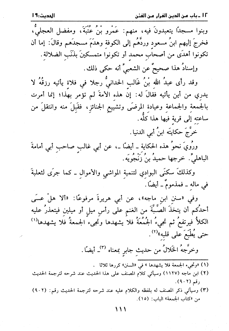 وبنوا مسجدا يتعبدون فيه، منهم: عمرو بن هتبة، ومفضل العجلي، فخرج إليهم ابن مسعود وردهم على الكوفة وهدم مسجدهم وقال: إما أن تكونوا أهدى من أصحاب محمد أو تكونوا متمسكين بذنب الضلالة. وإسناده هذا صحيح عن الشعبي أنه حكى ذلك. وقد رأى عبد الله بن غالب الحداني رجلا في فلاة رزقه لا يدري من أين يأتيه فقال له: إن هذه الأمة لم تؤمر بهذا؛ إنما أمرت بالجمعة والجماعة وعيادة المرضى وتشييع الجنائز، فقبل منه وانتقل من ساعته إلى قرية فيها هذا كله. خرج حكايته ابن أبي الدنيا. وروي نحو هذه الحكاية – أيضا -، عن أبي غالب صاحب أبي أمامة الباهلي. خرجها حميد بن زنجوية. وكذلك سكنى البوادي لتنمية المواشي والأموال – كما جرى لثعلبة في ماله – فمذموم – أيضا.