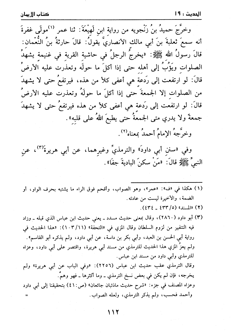 وخرج حميد بن زنجويه من رواية ابن لهيعه: ثنا عمر (¬1) مولى غفرة أنه سمع ثعلبة بن أبي مالك الأنصاري يقول: قال حارثة بن النعمان: قال رسول الله صَلَّى اللهُ عَلَيْهِ وَسَلَّمَ: " يخرج الرجل في حاشية القرية في غنيمة يشهد الصلوات ويؤب إلى أهله إذا أكل ما حوله وتعذرت عليه الأرض قال: لو ارتفعت إلى ردعة هي أعفى ملأ من هذه، فيرتفع حتى لا يشهد من الصلوات إلا الجمعة حتى إذا أكل ما حوله وتعذرت عليه الأرض قال: لو ارتفعت إلى ردعة هي أعفى كل أمن هذه فيرتفع حتى لا يشهد جمعة ولا يدري متى الجمعة حتى يطبع الله على قلبه ". وخرجه الإمام أحمد بمعناه (¬2) .