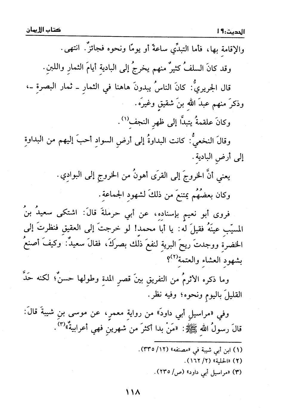 وقد كان السلف كثير منهم يخرج إلى البادية أيام الثمار واللبن. قال الجريري: كان الناس يبدون ها هنا في الثمار - ثمار قصيرة -، وذكر منهم عبد الله بن شقيق وغيره. وكان علقمة يتبدا إلى ظهر النجف (¬1) . وقال النخعي: كانت البداوة إلى أرض السواد أحب إليهم من البداوة إلى أرض البادية. يعني أن الخروج إلى القرى أهون من الخروج إلى البوادي. وكان بعضهم يمتنع من ذلك لشهود الجماعة.