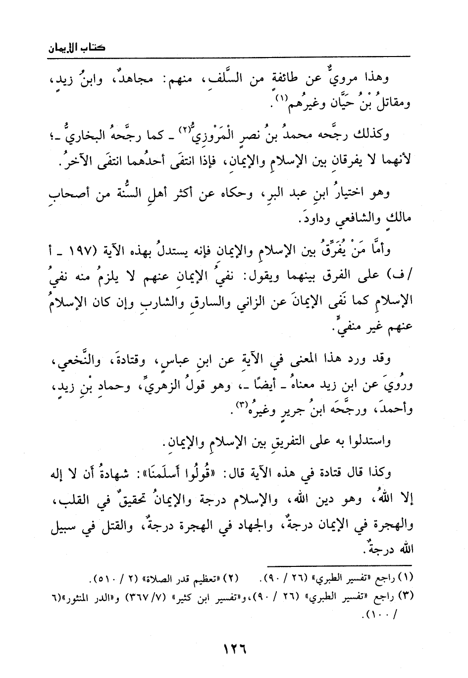 وأما من يفرق بين الإسلام والإيمان فإنه يستدل بهذه الآية (197 – أ / ف) على الفرق بينهما ويقول: نفي الإيمان عنهم لا يلزم منه نفي الإسلام كما نفي الإيمان عن الزاني والسارق والشارب وإن كان الإسلام عنهم غير منفي. وقد ورد هذا المعنى في الآية عن ابن عباس، وقتادة، والنخعي، وروي عن ابن زيد معناه – أيضا -، وهو قول الزهري، وحماد بن زيد، وأحمد، ورجحه ابن جرير وغيره (¬3) .
