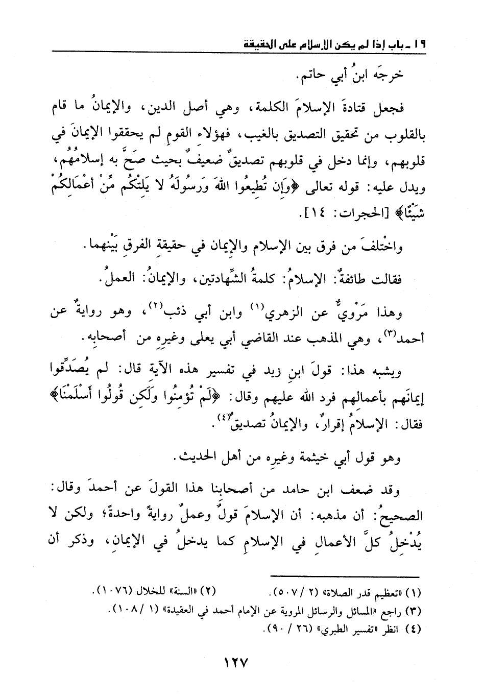 فجعل قتادة الإسلام الكلمة، وهي أصل الدين، والإيمان ما قام بالقلوب من تحقيق التصديق بالغيب، فهؤلاء القوم لم يحققوا الإيمان في قلوبهم، وإنما دخل في قلوبهم تصديق ضعيف بحيث صح به إسلامهم، ويدل عليه: {وَإِن تُطِيعُوا اللَّهَ وَرَسُولَهُ لا يَلِتْكُم مِّنْ أَعْمَالِكُمْ شَيْئًا} [الحجرات: 14] .