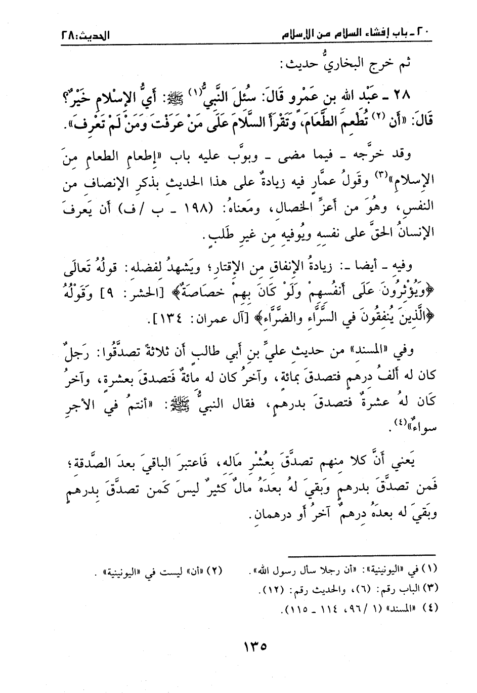 28 - عبد الله بن عمرو قال: سئل النبي (¬1) صَلَّى اللهُ عَلَيْهِ وَسَلَّمَ أي الإسلام خير؟ قال: " أن (¬2) تطعم الطعام وتقرأ السلام على من عرفت ومن لم تعرف ".
