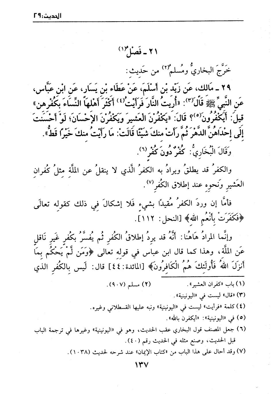 29 - مالك، عن زيد بن أسلم، عن عطاء بن يسار، عن ابن عباس عن النبي صَلَّى اللهُ عَلَيْهِ وَسَلَّمَ قال (¬1) : " أريت النار فرأيت (¬2) أكثر أهلها النساء بكفرهن " قيل أيكفرون (¬3) ؟ قال: " يكفرن العشير ويكفرن الإحسان؛ لو أحسنت إلى إحداهن الدهر ثم رأت منك شيئا قالت: ما رأيت منك خيرا قط "