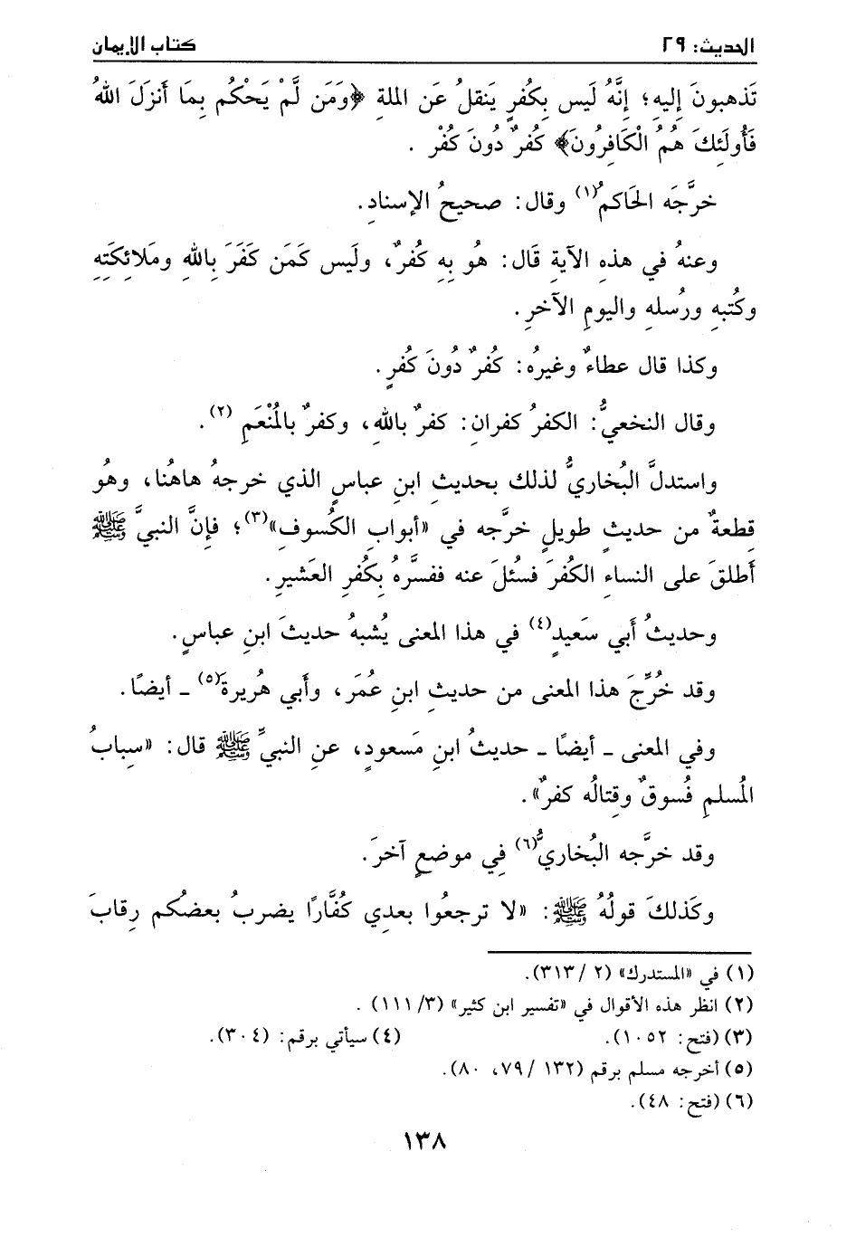 وعنه في هذه الآية قال: هو به كفر، وليس كمن كفر بالله وملائكته وكتبه ورسله واليوم الآخر. وكذا قال عطاء وغيره: كفر دون كفر. وقال النخعي: الكفران كفران: كفر بالله وكفر بالمنعم (¬2) . واستدل البخاري لذلك بحديث ابن عباس الذي خرجه هاهنا، وهو قطعة من حديث طويل خرجه في " أبواب الكسوف " (¬3) ، فإنه النبي صَلَّى اللهُ عَلَيْهِ وَسَلَّمَ أطلق على النساء الكفر فسئل عنه فسره بكفر العشير.