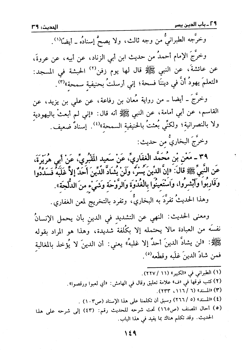 وهذا الحديث تفرد به البخاري، وتفرد بالتخريج لمعن الغفاري. ومعنى الحديث: النهي عن التشديد في الدين بأن يحمل الإنسان نفسه من العبادة مالا يحتمله إلا بكلفة شديدة، وهذا هو المراد بقوله صَلَّى اللهُ عَلَيْهِ وَسَلَّمَ " لن يشاد الدين أحد إلا غلبه " يعني: أن الدين لا يؤخذ بالمغالبة فمن شاد الدين غلبه وقطعه (¬1) .