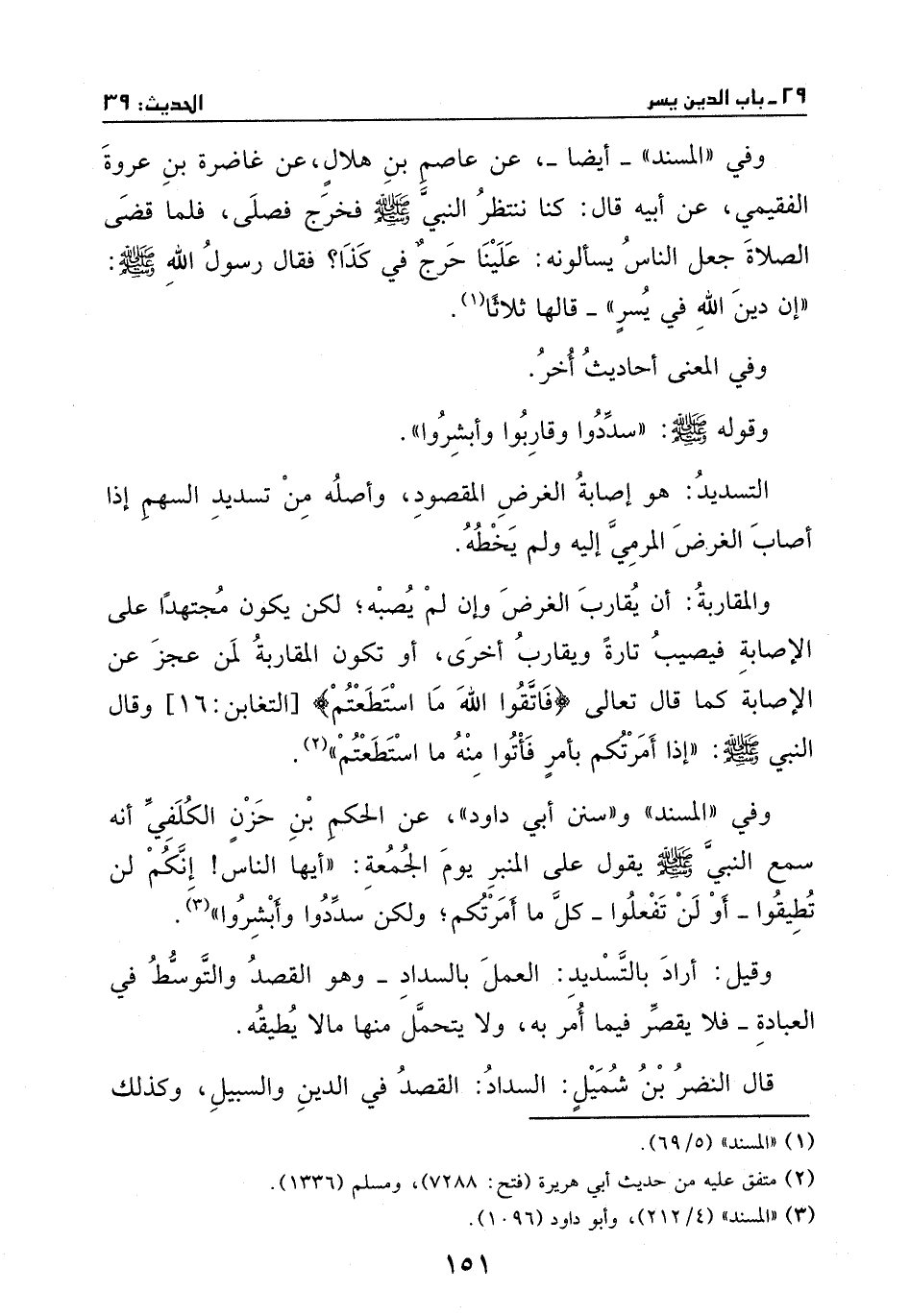 وفي " المسند " – أيضا -، عن عاصم بن هلال، عن غاضرة بن عروة الفقيمي، عن أبيه: كنا ننتظر النبي صَلَّى اللهُ عَلَيْهِ وَسَلَّمَ فخرج فصلى، فلما قضى الصلاة جعل الناس يسألونه: علينا حرج في كذا؟ فقال رسول الله صَلَّى اللهُ عَلَيْهِ وَسَلَّمَ " إن دين الله في يسر " – قالها ثلاثا (¬1) . وفي المعنى أحاديث أخر. وقوله صَلَّى اللهُ عَلَيْهِ وَسَلَّمَ: سددوا وقاربوا وأبشروا ". التسديد: هو إصابة الغرض المقصود، وأصله من تسديد السهم إذا أصاب الغرض المرمى إليه ولم يخطه. والمقاربة: أن يقارب الغرض وإن لم يصبه؛ لكن يكون مجتهدا على الإصابة فيصيب تارة ويقارب تارة أخرى، أو تكون المقاربة لمن عجز عن الإصابة كما قال تعالى {فاتقوا الله ما استطعتم} [التغابن: 16] وقال النبي صَلَّى اللهُ عَلَيْهِ وَسَلَّمَ: " إذا أمرتكم بأمر فأتوا منه ما استطعتم " (¬2) .