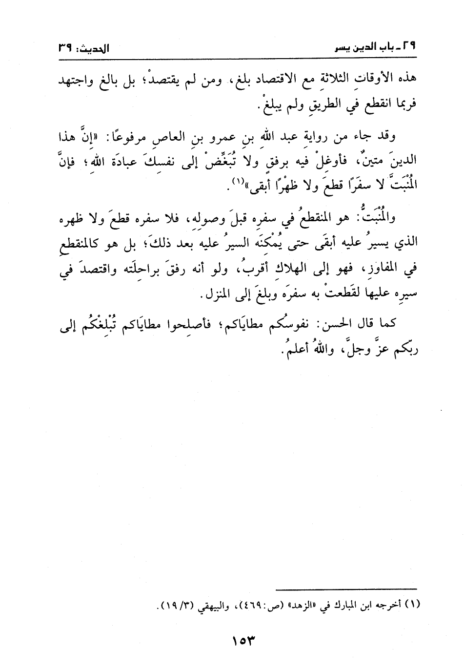وقد جاء في رواية عبد الله بن عمرو بن العاص مرفوعا: " إن هذا الدين متين، فأوغل فيه برفق ولا تبغض إلى نفسك عبادة الله؛ فإن المنبت لا سفرا قطع ولا ظهرا أبقى " (¬1) .