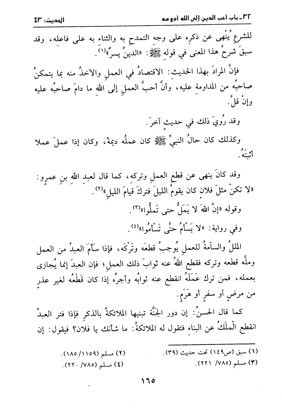 فإن المراد بهذا الحديث: الاقتصاد في العمل والأخذ منه بما يتمكن صاحبه من المداومة عليه، وأن أحب العمل إلى الله مادام صاحبه عليه وإن قل. وقد روي ذلك في حديث آخر. وكذلك كان حال النبي صَلَّى اللهُ عَلَيْهِ وَسَلَّمَ كان عمله ديمة، وكان إذا عمل عملا أثبته. وقد كان ينهى عن قطع العمل وتركه، كما قال لعبد الله بن عمرو " لا تكن مثل فلان كان يقوم الليل فترك قيام الليل " (¬2) . وقوله " إن الله لا يمل حتى تملوا " (¬3) . وفي رواية: " لا يسأم حتى تسأموا " (¬4) . الملل والسآمة للعمل يوجب قطعه وتركه، فإذا سأم العبد من العمل ومله قطعه وتركه فقطع الله عنه ثواب ذلك العمل؛ فإن العبد إنما يجازى بعمله، فمن ترك عمله انقطع عنه ثوابه وأجره إذا كان قطعه لغير عذر من مرض أو سفر أو هرم.