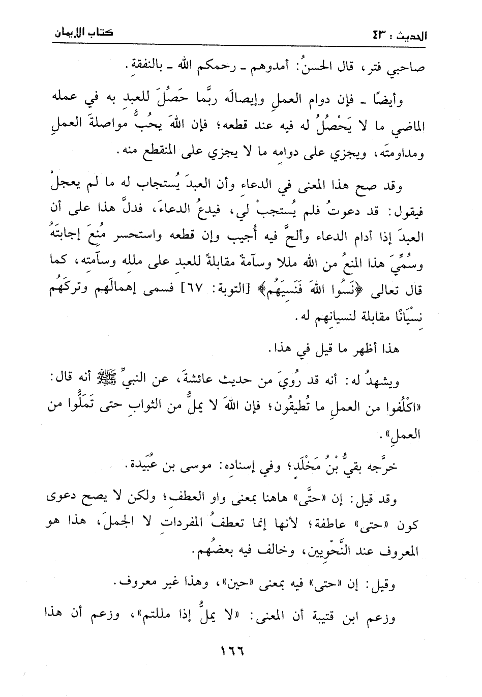 وقد صح هذا المعنى في الدعاء وأن العبد يستجاب له ما لم يعجل فيقول: قد دعوت فلم يستجب لي، فيدع الدعاء، فدل هذا على أن العبد إذا أدام الدعاء وألح فيه أجيب وإن قطعه واستحسر منع إجابته وسمي هذا المنع من الله مللا وسآمة مقابلة للعبد على ملله وسآمته، كما قال تعالى {نسوا الله فنسيهم} [التوبة: 67] فسمى إهمالهم وتركهم نسيانا مقابلة لنسيانهم له. هذا أظهر ماقيل في هذا. ويشهد له: أنه قد روي من حديث عائشة، عن النبي صَلَّى اللهُ عَلَيْهِ وَسَلَّمَ أنه قال: " اكلفوا من العمل ما تطيقون؛ فإن الله لا يمل من الثواب حتى تملوا من العمل ". خرجه بقي بن مخلد؛ وفي إسناده: موسى بن عبيدة. وقد قيل: إن " حتى " هاهنا بمعنى واو العطف؛ ولكن لا يصح دعوى كون " حتى " عاطفة؛ لأنها إنما تعطف المفردات لا الجمل، هذا هو المعروف عند النحويين، وخالف فيه بعضهم. وقيل: إن " حتى " فيه بمعنى " حين "، وهذا غير معروف. وزعم ابن قتيبة أن المعنى: " لا يمل إذا مللتم "، وزعم أن هذا