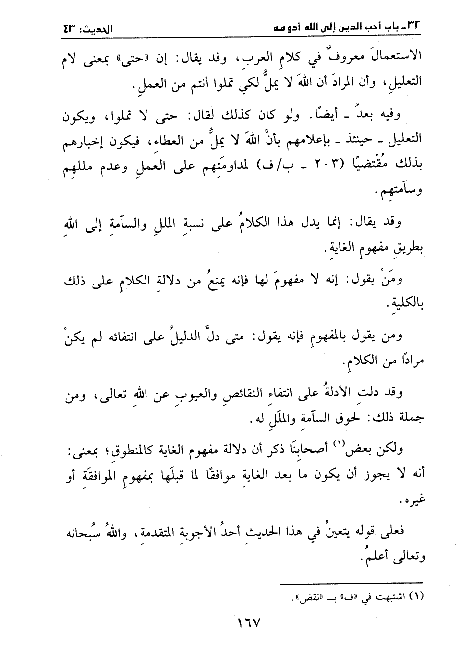 وقد يقال: إنما يدل هذا الكلام عل نسبة الملل والسآمة إلى الله بطريق مفهوم الغاية. ومن يقول: إنه لا مفهوم لها فإنه يمنع من دلالة الكلام على ذلك بالكلية. ومن يقول ذلك بالمفهوم فإنه يقول: متى دل الدليل على انتقائه لم يكن مرادا من الكلام. وقد دلت الأدلة عل انتفاء النقائص والعيوب عن الله تعالى، ومن جملة ذلك: لحوق السآمة والملل له.