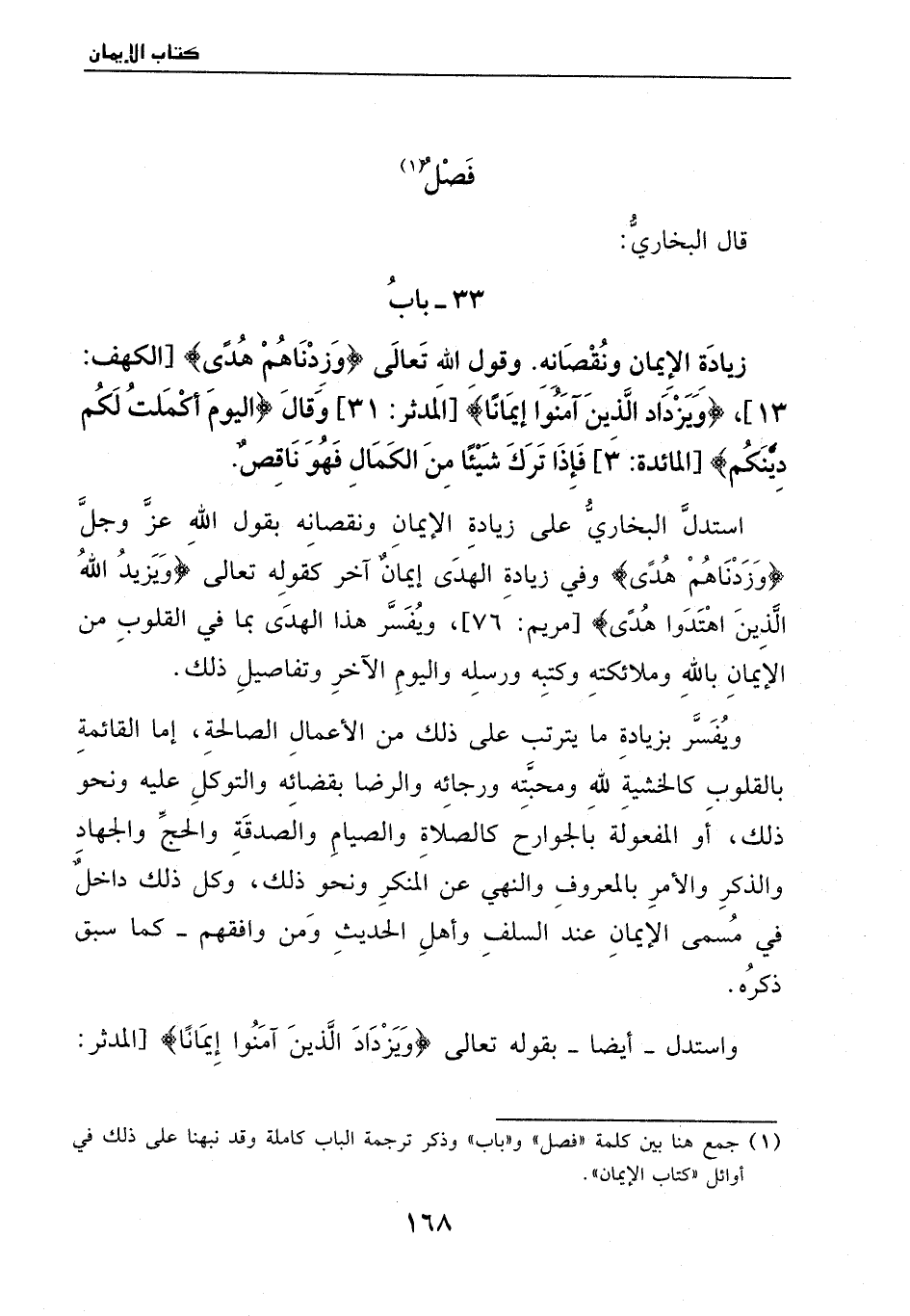 زيادة الإيمان ونقصانه. وقول الله تعالى {وَزِدْنَاهُمْ هُدًى} [الكهف: 13] ، {وَيَزْدَادَ الَّذِينَ آمَنُوا إِيمَانًا} [المدثر: 31] وقال {الْيَوْمَ أَكْمَلْتُ لَكُمْ دِينَكُمْ} [المائدة: 3] فإذا ترك شيئا من الكمال فهو ناقص.