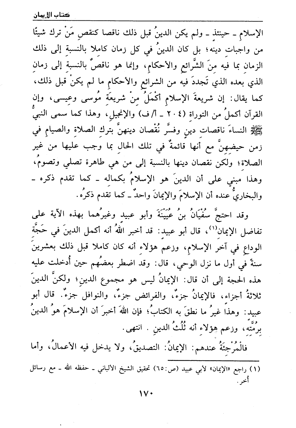 الإسلام – حينئذ – ولم يكن الدين قبل ذلك ناقصا كنقص من ترك شيئا من واجبات دينه؛ بل كان الدين في كل زمان كاملا بالنسبة إلى ذلك الزمان بما فيه من الشرائع والأحكام ما لم يكن قبل ذلك، كما يقال: إن شريعة الإسلام أكمل من شريعة موسى وعيسى، وإن القرآن أكمل من التوراة (204 – أ / ف) والإنجيل، وهذا كما سمى النبي صَلَّى اللهُ عَلَيْهِ وَسَلَّمَ النساء ناقصات دين وفسر نقصان دينهن بترك الصلاة والصيام في زمن حيضهن مع أنها قائمة في تلك الحال بما وجب عليها من غير الصلاة؛ ولكن نقصان دينها بالنسبة إلى من هي طاهرة تصلي وتصوم. وهذا مبني على أن الدين هو الإسلام بكماله – كما تقدم ذكره – والبخاري عنده أن الإسلام والإيمان واحد – كما تقدم ذكره.