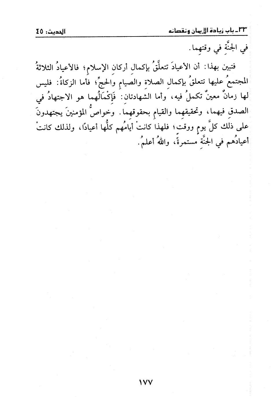 فتبين بهذا: أن الأعياد تتعلق بإكمال أركان الإسلام؛ فالأعياد الثلاثة المجتمع عليها تتعلق بإكمال الصلاة والصيام والحج؛ فأما الزكاة: فليس لها زمان معين تكمل فيه، وأما الشهادتان: فإكمالهما هو الاجتهاد في الصدق فيهما، وتحقيقهما والقيام بحقوقهما. وخواص المؤمنين يجتهدون على ذلك كل يوم ووقت؛ فلهذا كانت أيامهم كلها أعياد، ولذلك كانت أعيادهم في الجنة مستمرة، والله أعلم.