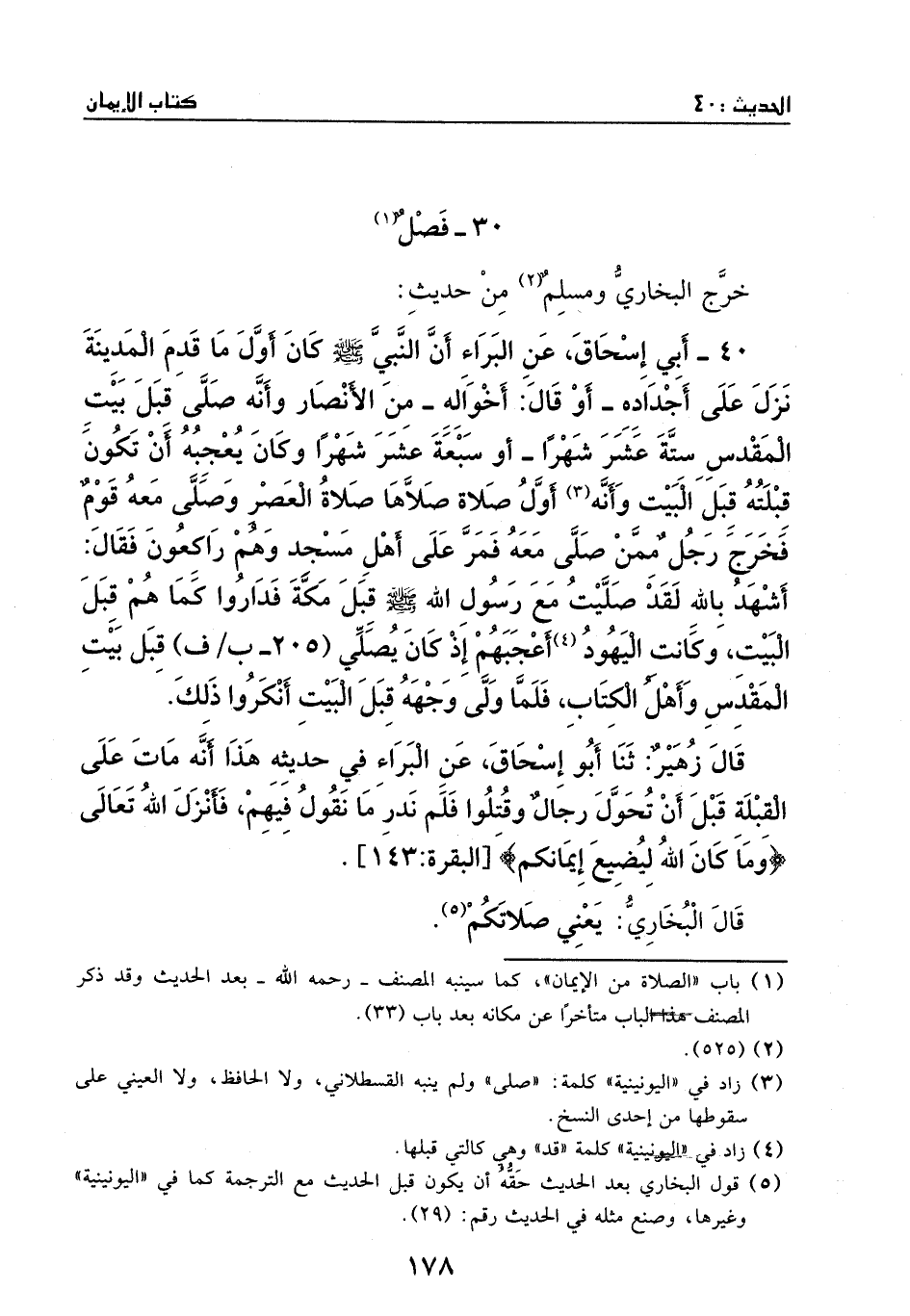 40 - أبي إسحاق، عن البراء أن النبي صَلَّى اللهُ عَلَيْهِ وَسَلَّمَ كان أول ما قدم المدينة نزل على أجداده – أو قال: أخواله – من الأنصار وأنه صلى قبل بيت المقدس ستة عشر شهرا - أو سبعة عشر شهرا وكان يعجبه أن تكون قبلته قبل البيت وأنه (¬1) أول صلاة صلاها صلاة العصر وصلى معه قوم فخرج رجل ممن صلى معه فمر على أهل مسجد وهم راكعون فقال: أشهد بالله لقد صليت مع رسول الله صَلَّى اللهُ عَلَيْهِ وَسَلَّمَ قبل مكة فداروا كما هم قبل البيت وكانت اليهود (¬2) أعجبهم إذ كان يصلي (205 – ب / ف) قبل بيت المقدس وأهل الكتاب، فلما ولى وجهته قبل البيت أنكروا ذلك. قال زهير: ثنا أبو إسحاق، عن البراء في حديثه هذا أنه مات على القبلة قبل أن تحول رجال وقتلوا فلم ندر ما نقول فيهم، فأنزل الله تعالى {وَمَا كَانَ اللهُ لِيُضِيعَ إِيمَانَكُم} [البقرة: 143] ْ قال البخاري: يعني صلاتكم (¬3) .