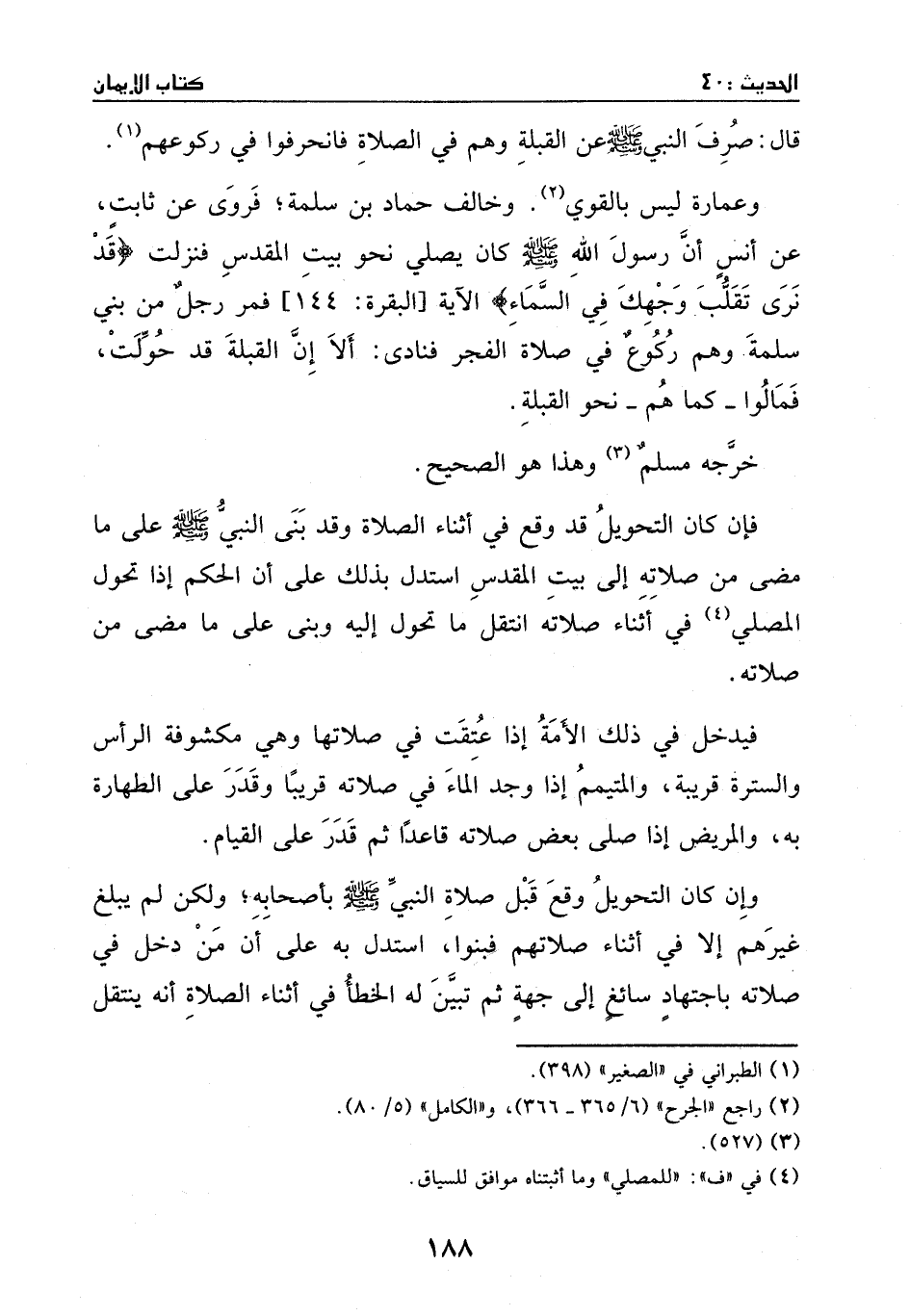 وعمارة ليس بالقوي (¬2) . وخالف حماد بن سلمة؛ فروى عن ثابت، عن أنس أن رسول الله صَلَّى اللهُ عَلَيْهِ وَسَلَّمَ كان يصلي نحو بيت المقدس فنزلت {قَدْ نَرَى تَقَلُّبَ وَجْهِكَ فِي السَّمَاء} الآية [البقرة: 144] فمر رجل من بني سلمة وهم ركوع في صلاة الفجر فنادى: ألا إن القبلة قد حولت، فمالوا – كما هم – نحو القبلة. خرجه مسلم (¬3) وهذا هو الصحيح.
