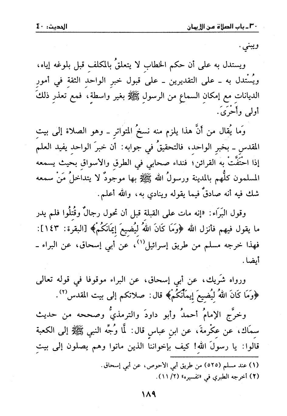 ويبني. ويستدل به على أن حكم الخطاب لا يتعلق بالمكلف قبل بلوغه إياه، ويستدل به – على التقديرين – على قبول خبر الواحد الثقة في أمور الديانات مع إمكان السماع من الرسول صَلَّى اللهُ عَلَيْهِ وَسَلَّمَ بغير واسطة، فمع تعذر ذلك أولى وأحرى. وما يقال من أن هذا يلزم منه نسخ المتواتر – وهو الصلاة إلى بيت المقدس – بخبر الواحد، فالتحقيق في جوابه: أن خبر الواحد يفيد العلم إذا احتفت به القرائن؛ فنداء صحابي في الطرق والأسواق بحيث يسمعه المسلمون كلهم بالمدينة ورسول الله صَلَّى اللهُ عَلَيْهِ وَسَلَّمَ بها موجود لا يتداخل من سمعه شك فيه أنه صادق فيما يقوله وينادي به، والله أعلم.