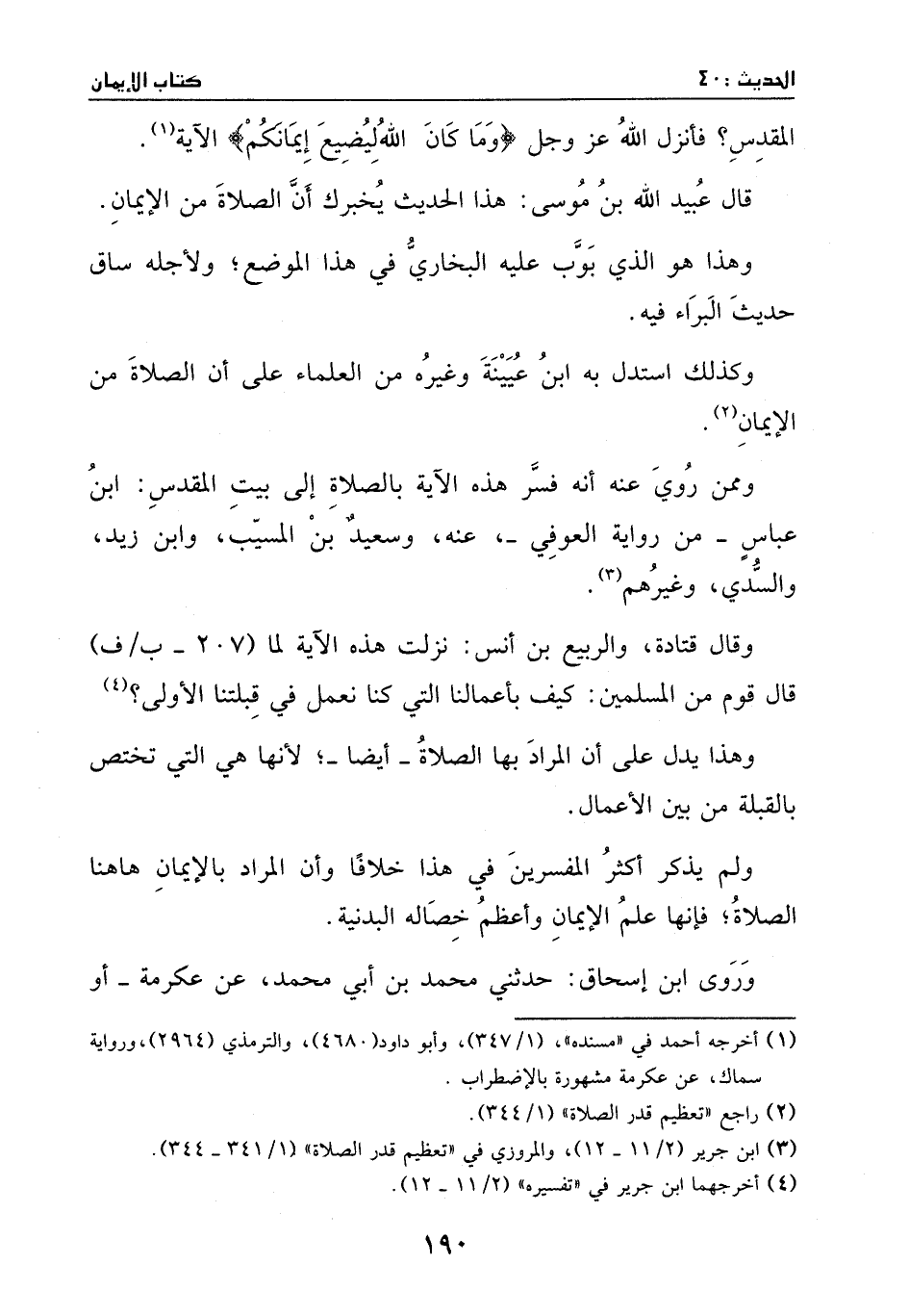 وقال قتادة، والربيع بن أنس: نزلت هذه الآية لما (207 – ب / ف) قال قوم من المسلمين: كيف بأعمالنا التي كنا نعمل في قبلتنا الأولى؟ (¬4) . وهذا يدل على أن المراد بها الصلاة – أيضا _؛ لأنها هي التي تختص بالقبلة من بين الأعمال. ولم يذكر أكثر المفسرين في هذا خلافا وأن المراد بالإيمان هاهنا الصلاة؛ فإنها علم الإيمان وأعظم خصاله البدنية. وروى ابن إسحاق: حدثني محمد بن أبي محمد، عن عكرمة – أو