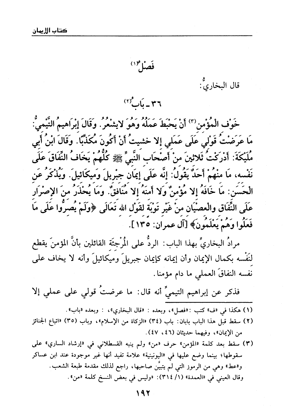 (¬2) سقط بعد كلمة " المؤمن " حرف " من " ولم ينبه القسطلاني في " إرشاد الساري " على سقوطها؛ بينما وضع عليها في " اليونينية " علامة تفيد أنها غير موجودة عند ابن عساكر و" عط " وهي من الرموز التي لم يتبين صاحبها، راجع لذلك مقدمة طبعة الشعب. وقال العيني في " العمدة " (1 / 314) : " وليس في بعض النسخ كلمة " من ".