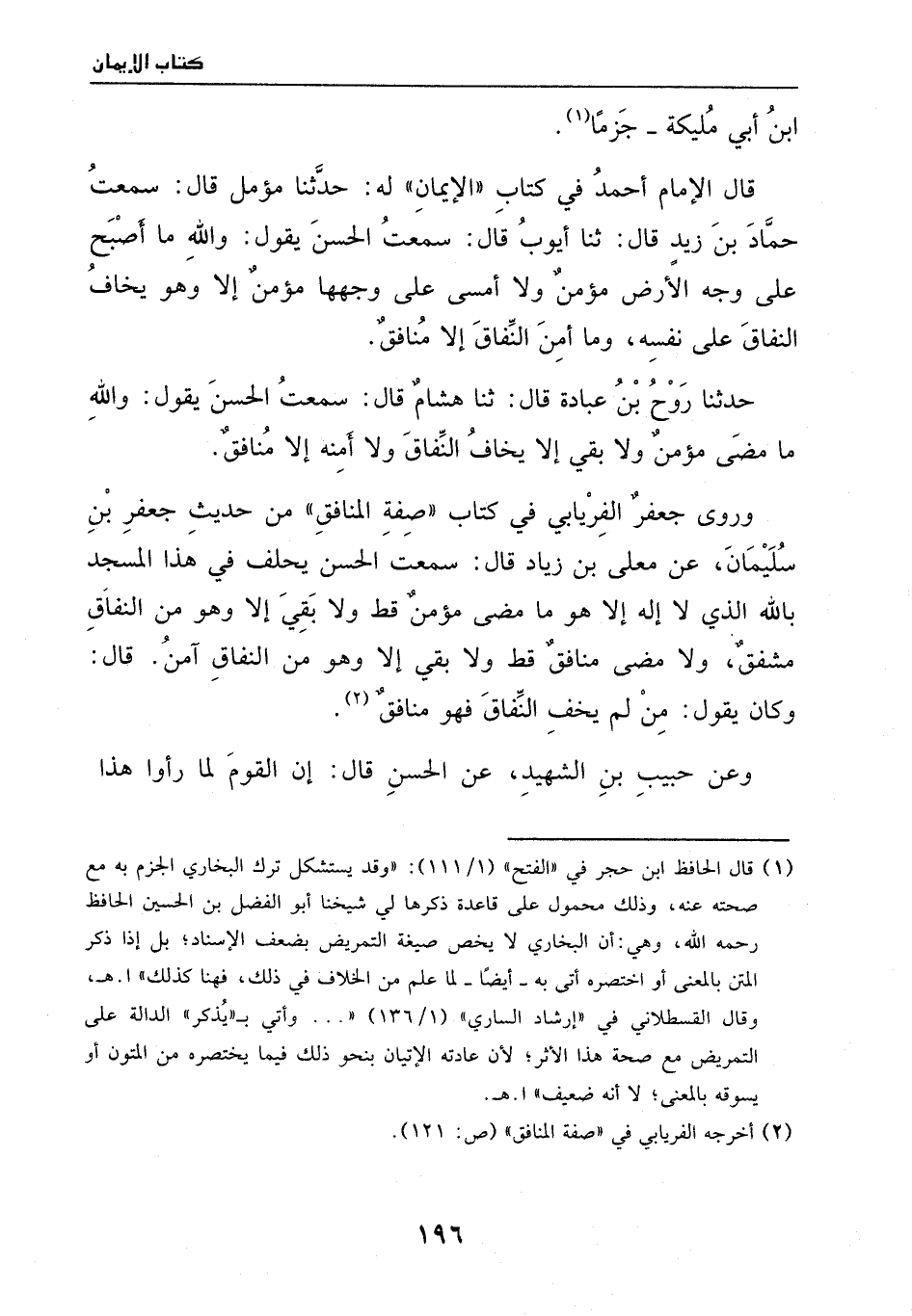 قال الإمام أحمد في كتاب " الإيمان " له: حدثنا مؤمل قال: سمعت حماد بن زيد قال: ثنا أيوب قال: سمعت الحسن يقول: والله ما أصبح على وجه الأرض مؤمن ولا أمسى على وجهها مؤمن إلا وهو يخاف النفاق على نفسه، وما أمن النفاق إلا منافق.