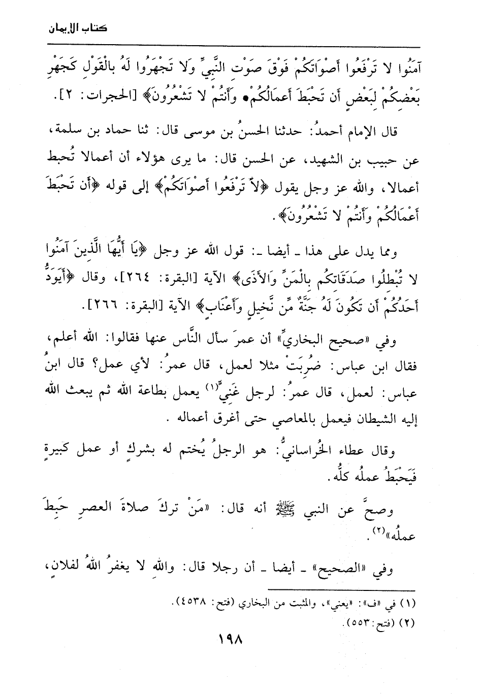 آمَنُوا لا تَرْفَعُوا أَصْوَاتَكُمْ فَوْقَ صَوْتِ النَّبِيِّ وَلا تَجْهَرُوا لَهُ بِالْقَوْلِ كَجَهْرِ بَعْضِكُمْ لِبَعْضٍ أَن تَحْبَطَ أَعْمَالُكُمْ وَأَنتُمْ لا تَشْعُرُونَ} [الحجرات: 2] قال الإمام أحمد حدثنا الحسن بن موسى قال: ثنا حماد بن سلمة عن حبيب بن الشهيد، عن الحسن قال: ما يرى هؤلاء أن أعمالا تحبط أعمالا، والله عز وجل يقول {لا تَرْفَعُوا أَصْوَاتَكُمْ} إلى قوله {أَن تَحْبَطَ أَعْمَالُكُمْ وَأَنتُمْ لا تَشْعُرُونَ} . ومما يدل على هذا – أيضا – قول الله عز وجل {يَا أَيُّهَا الَّذِينَ آمَنُوا لاَ تُبْطِلُواْ صَدَقَاتِكُم بِالْمَنِّ وَالأذَى} الآية [البقرة: 264] ، وقال {أَيَوَدُّ أَحَدُكُمْ أَن تَكُونَ لَهُ جَنَّةٌ مِّن نَّخِيلٍ وَأَعْنَاب} الآية [البقرة: 266] . وفي صحيح البخاري " أن عمر سأل الناس عنها فقالوا: الله أعلم فقال ابن عباس: ضربت مثلا لعمل، قال عمر: لأي عمل؟ قال ابن عباس: لعمل، قال عمر: لرجل غني (¬1) يعمل بطاعة الله ثم يبعث الله إليه الشيطان فيعمل بالمعاصي حتى أغرق أعماله.