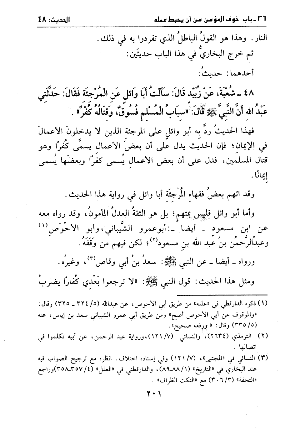 48 - شعبة، عن زبيد قال: سألت أبا وائل عن المرجئة فقال: حدثني عبد الله أن النبي صَلَّى اللهُ عَلَيْهِ وَسَلَّمَ قال: " سباب المسلم فسوق، وقتاله كفر ".