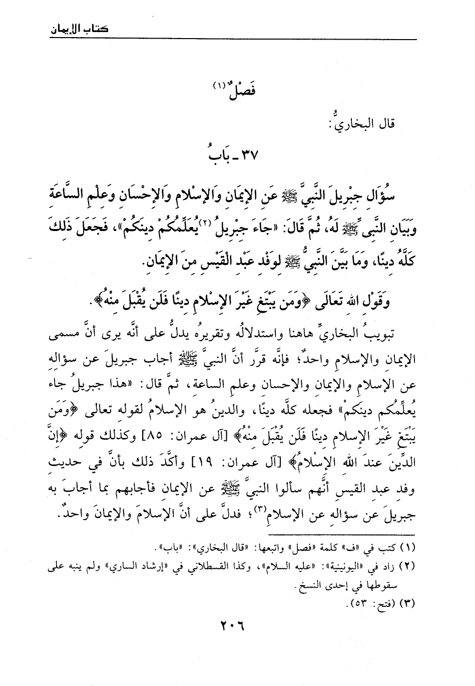 تبويب البخاري هاهنا واستدلاله وتقريره يدل عل أنه يرى أن مسمى الإيمان والإسلام واحد؛ فإنه قرر النبي صَلَّى اللهُ عَلَيْهِ وَسَلَّمَ أجاب جبريل عن سؤاله عن الإسلام والإيمان والإحسان وعلم الساعة، ثم قال: " هذا جبريل جاء يعلمكم دينكم " فجعله كله دينا، والدين هو الإسلام لقوله تعالى {وَمَن يَبْتَغِ غَيْرَ الإِسْلاَمِ دِينًا فَلَن يُقْبَلَ مِنْه} [آل عمران: 85] وكذلك قوله {إِنَّ الدِّينَ عِندَ اللهِ الإِسْلاَمُ} [آل عمران: 19] وأكد ذلك بأن في حديث وفد عبد القيس أنهم سألوا النبي صَلَّى اللهُ عَلَيْهِ وَسَلَّمَ عن الإيمان فأجابهم بما أجاب به جبريل عن سؤاله عن الإسلام (¬2) ؛ فدل على أن الإسلام والإيمان واحد.