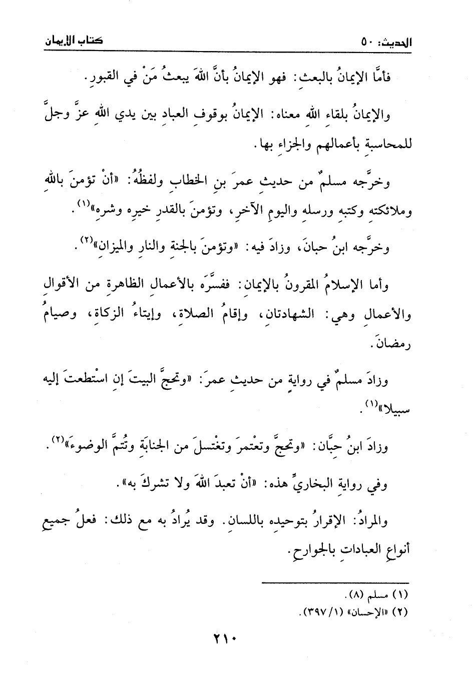 فأما الإيمان بالبعث: فهو الإيمان بأن الله يبعث من في القبور. والإيمان بلقاء الله معناه: الإيمان بوقوف العباد بين يدي الله عز وجل للمحاسبة بأعمالهم والجزاء بها. وخرجه مسلم من حديث عمر بن الخطاب ولفظه: " أن تؤمن بالله وملائكته وكتبه ورسله واليوم الآخر، وتؤمن بالقدر خيره وشره " (¬1) . وخرجه ابن حبان، وزاد فيه: " وتؤمن بالجنة والنار والميزان " (¬2) . وأما الإسلام المقرون بالإيمان: ففسره بالأعمال الظاهرة من الأقوال والأعمال وهي: الشهادتان، وإقام الصلاة، وإيتاء الزكاة، وصيام رمضان. وزاد مسلم في رواية من حديث عمر: " وتحج البيت إن استطعت إليه سبيلا ". وزاد ابن حبان: " وتحج وتعتمر وتغتسل من الجنابة وتتم الوضوء ". وفي رواية البخاري هذه: " أن تعبد الله ولا تشرك به ". والمراد: الإقرار بتوحيده باللسان. وقد يراد به مع ذلك: فعل جميع أنواع العبادات بالجوارح.