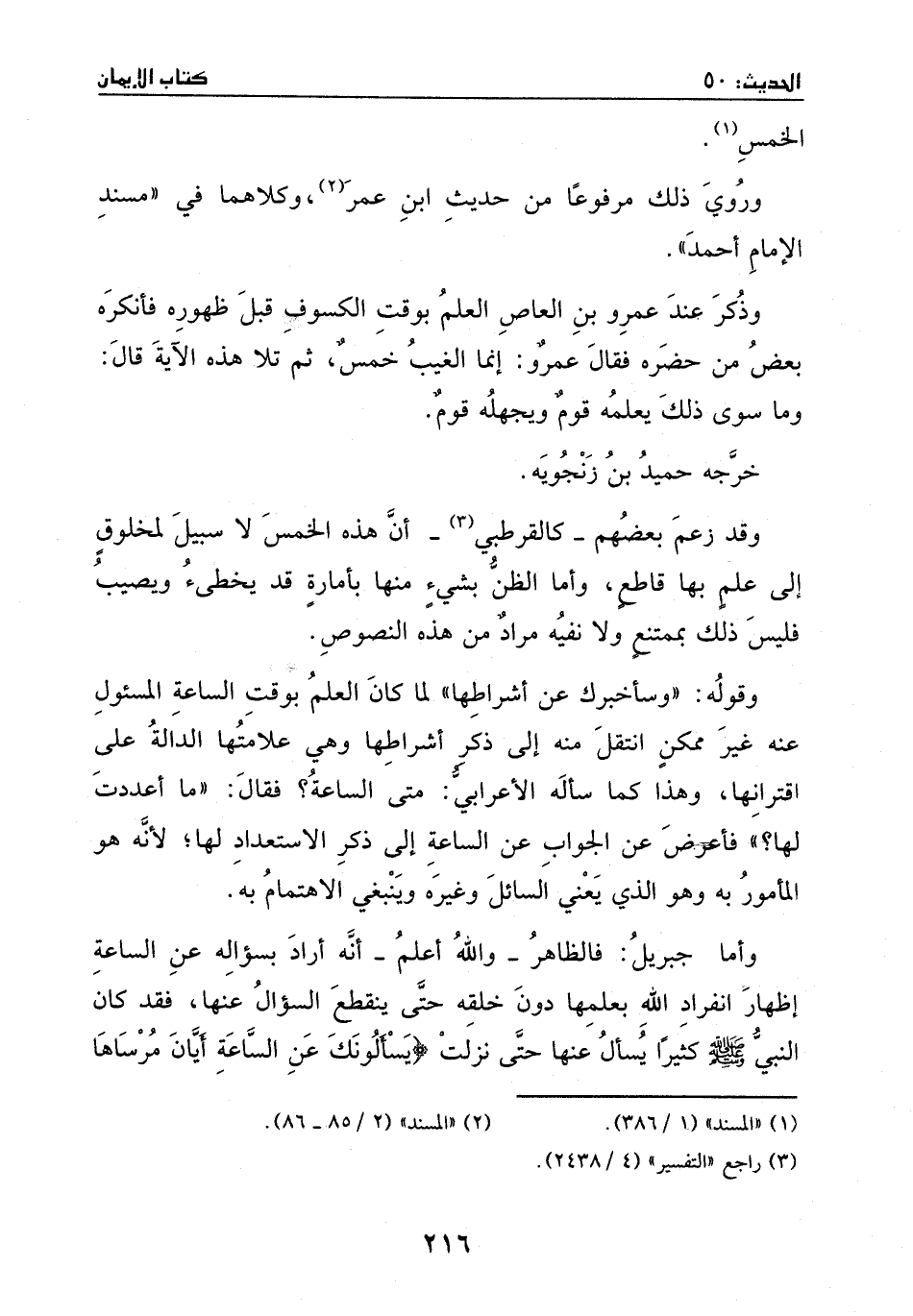 وقد زعم بعضهم – كالقرطبي (¬3) – أن هذه الخمس لا سبيل لمخلوق على علم بها قاطع، وأما الظن بشيء منها بأمارة قد يخطيء ويصيب فليس ذلك بممتنع ولا نفيه مراد من هذه النصوص. وقوله: " وسأخبرك عن أشراطها " لما كان العلم بوقت الساعة المسئول عنه غير ممكن انتقل منه إلى ذكر أشراطها وهي علامتها الدالة على اقترانها، وهذا كما سأله الأعرابي: متى الساعة؟ فقال: " ما أعددت لها؟ " فأعرض عن الجواب عن الساعة إلى ذكر الاستعداد لها؛ لأنه هو المأمور به وهو الذي يعني السائل وغيره وينبغي الاهتمام به. وأما جبريل: فالظاهر – والله أعلم – أنه أراد بسؤاله عن الساعة إظهار انفراد الله بعلمها دون خلقه حتى ينقطع السؤال عنها، فقد كان النبي صَلَّى اللهُ عَلَيْهِ وَسَلَّمَ كثيرا يسأل عنها حتى نزلت {يَسْأَلُونَكَ عَنِ السَّاعَةِ أَيَّانَ مُرْسَاهَا