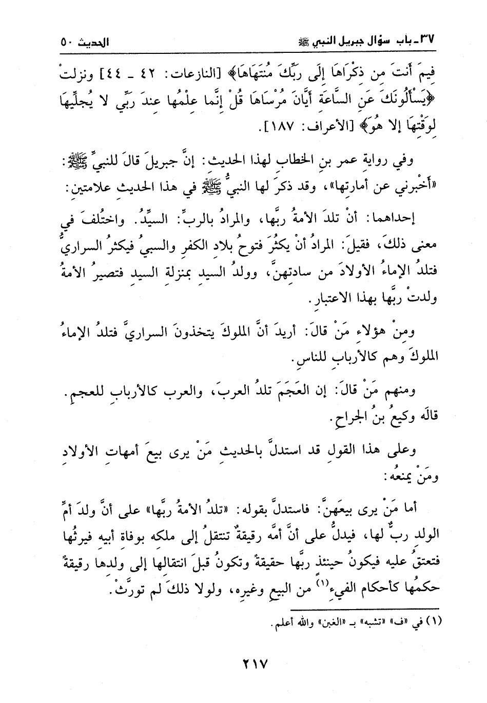 وفي رواية عمر بن الخطاب لهذا الحديث: إن جبريل قال للنبي صَلَّى اللهُ عَلَيْهِ وَسَلَّمَ " أخبرني عن أمارتها "، وقد ذكر لها النبي صَلَّى اللهُ عَلَيْهِ وَسَلَّمَ في هذا الحديث علامتين: