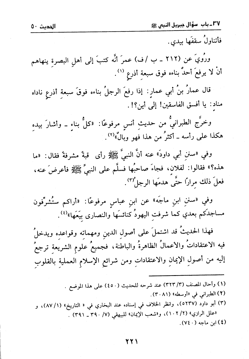 وفي " سنن ابن ماجه " عن ابن عباس مرفوعا: " أراكم ستشرفون مساجدكم بعدي كما شرفت اليهود كنائسها والنصارى بيعها (¬4) . فهذا الحديث قد اشتمل على أصول الدين ومهماته وقواعده ويدخل فيه الإعتقادات والأعمال الظاهرة والباطنة، فجميع علوم الشريعة ترجع إليه من أصول الإيمان والإعتقادات ومن شرائع الإسلام العملية بالقلوب