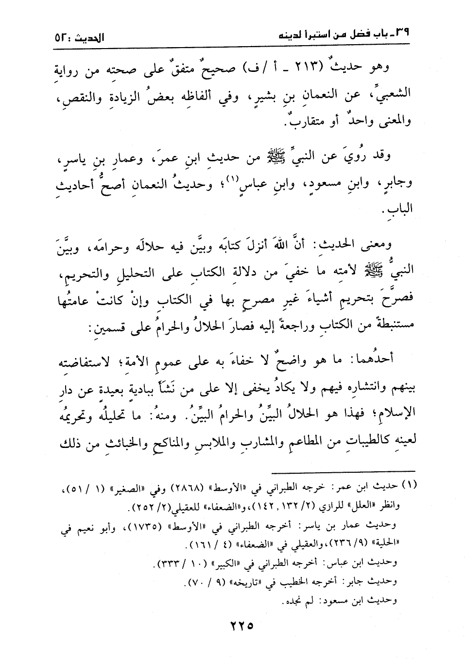 وهو حديث (213 - أ / ف) صحيح متفق على صحته من رواية الشعبي عن النعمان بن بشير، وفي ألفاظه بعض الزيادة والنقص والمعنى واحد أو متقارب.