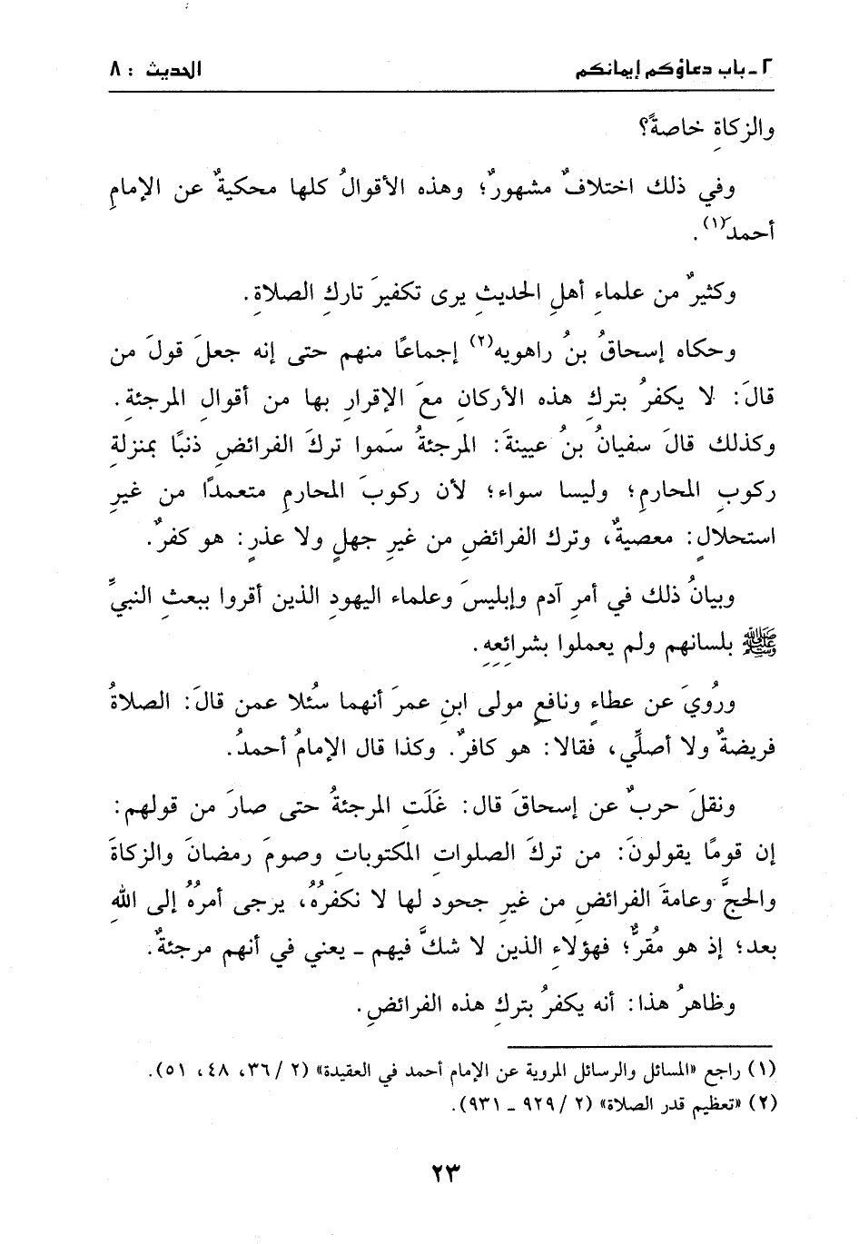 ونقل حرب عن إسحاق قال: غلت المرجئة حتى صار من قولهم: إن قوما يقولون: من ترك الصلوات المكتوبات وصوم رمضان والزكاة والحج وعامة الفرائض من غير جحود لها لا نكفره، يرجى أمره إلى الله بعد، إذ هو مقر، فهؤلاء الذين لا شك فيهم - يعني في أنهم مرجئة. وظاهر هذا: أنه يكفر بترك هذه الفرائض.