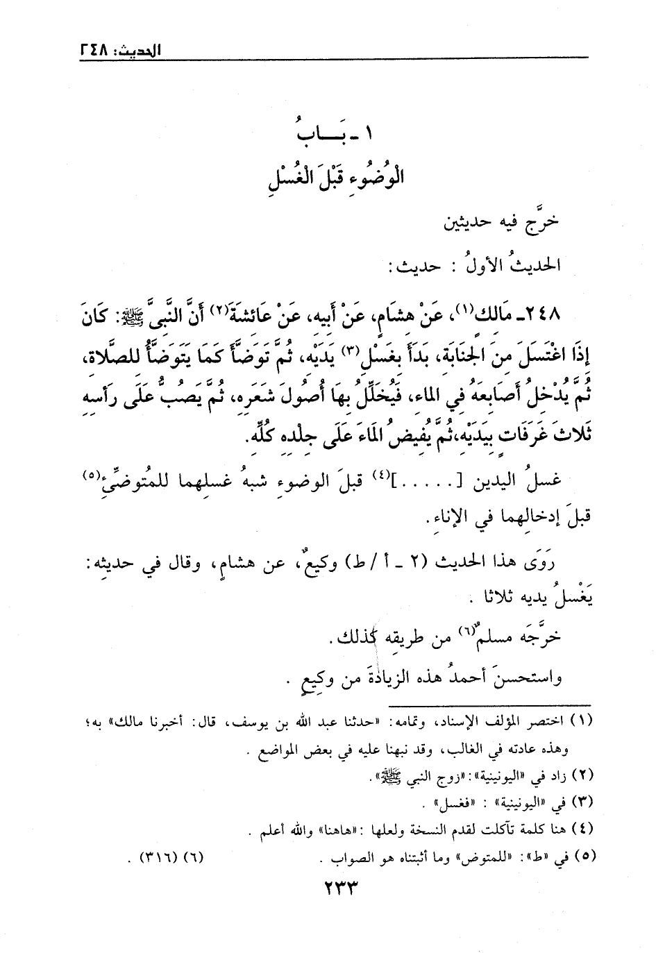 248 - حديث: مالك، عن هشام، عن أبيه، عن عائشة، أن النبي - صَلَّى اللهُ عَلَيْهِ وَسَلَّمَ - كانَ إذا أغتسل من الجنابة بدأ بغسل يديه، ثم توضأ كما يتوضأ للصلاة، ثم يدخل أصابعه في الماء، فيخلل بها أصول شعره، ثم يصب على رأسه ثلاث غرفات بيديه، ثم يفيض الماء على جلده كله.