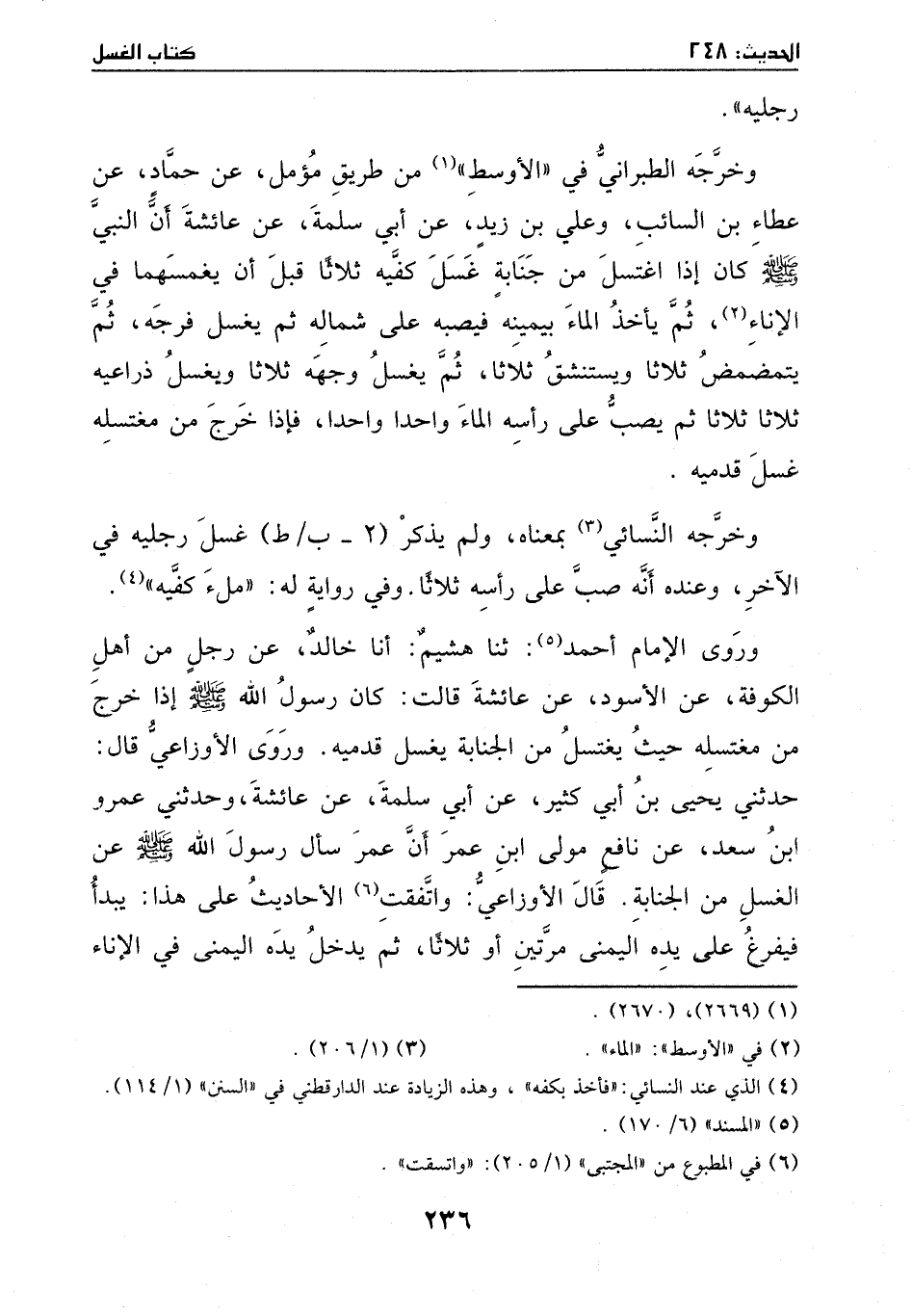 وروى الإمام أحمد: ثنا هشيم: أنا خالد، عن رجل من أهل الكوفة، عن الأسود، عن عائشة، قالت: كانَ رسول الله - صَلَّى اللهُ عَلَيْهِ وَسَلَّمَ - إذا خرج من مغتسله حيث يغتسل من الجنابة يغسل قدميه.